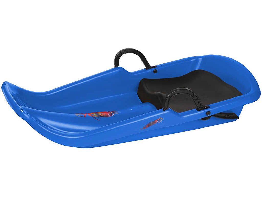 Bob plastový CYCLONE v modré barvě, pro děti, na sníh. Boby se dvěma brzdami a sedátkem. Určeno pro rekreační sport. Vestavěné sedátko odděluje dítě od studeného sněhu a tím zajišťuje lepší podmínky