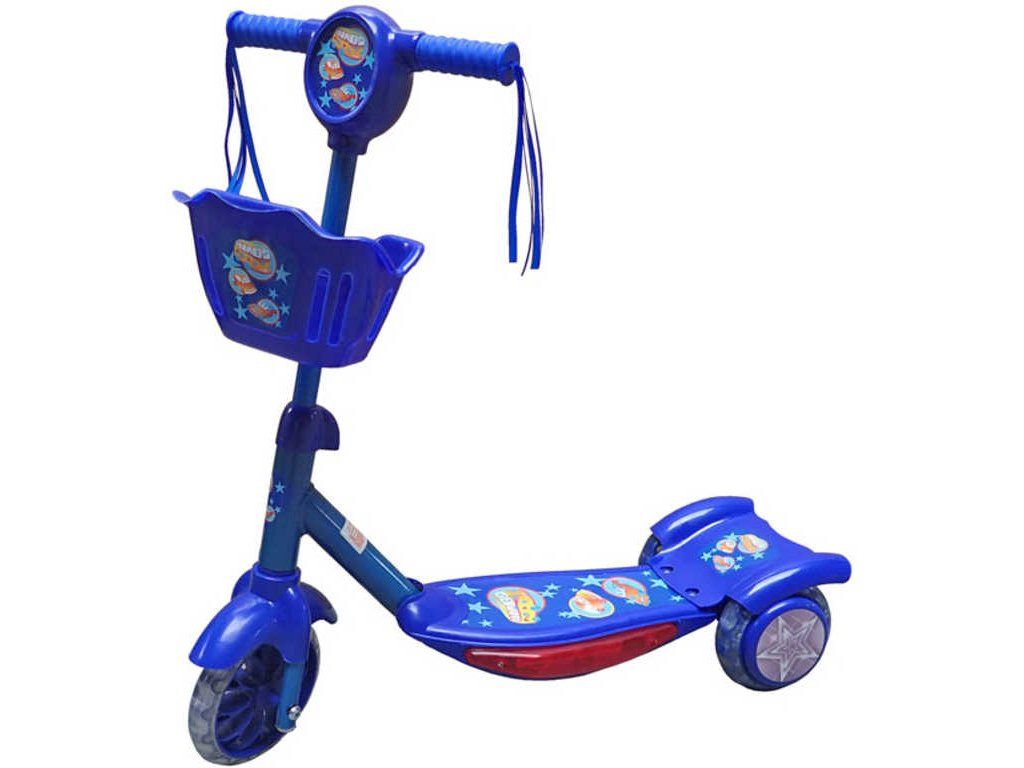 Modrá klučičí koloběžka z oceli a plastu, se třemi kolečky, s košíčkem na řídítkách, se samolepkami (motiv se může lišit od vyobrazení). Třásně na řídítkách. Kolečka jsou vyrobeny z plastu.