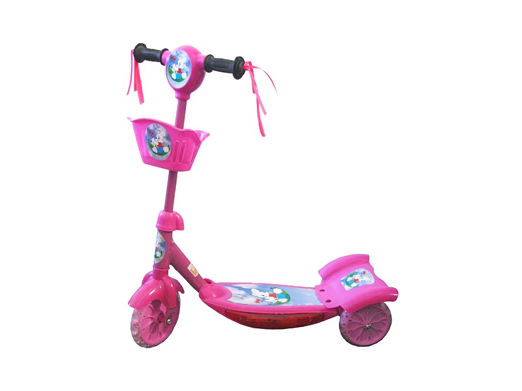 Růžová klučičí koloběžka z oceli a plastu, se třemi kolečky, s košíčkem na řídítkách, se samolepkami (motiv se může lišit od vyobrazení). Třásně na řídítkách. Kolečka jsou vyrobeny z plastu.