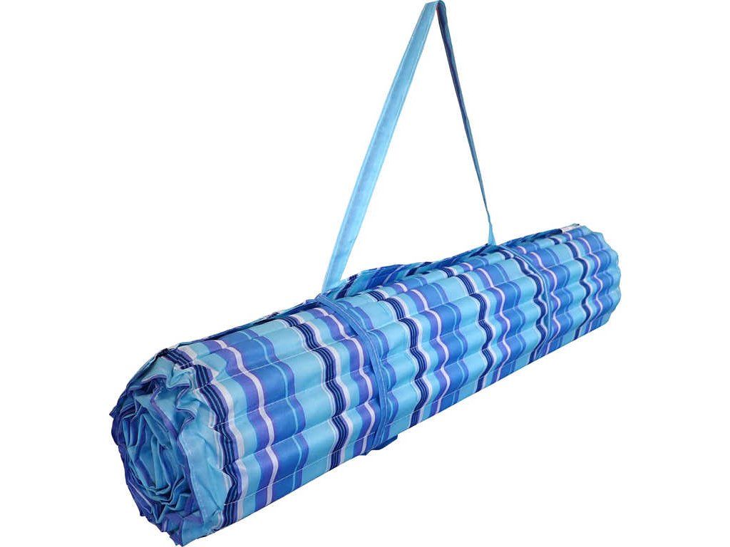 Plážové rolovací lehátko modré - nový a velmi skladný typ lehátka. Výplní jsou trubky z nenasáklivého molitanu, do sebe vzájemně zapadající a umožňující úsporné složení lehátka do úhledného balíčku. Potah je bavlněný s