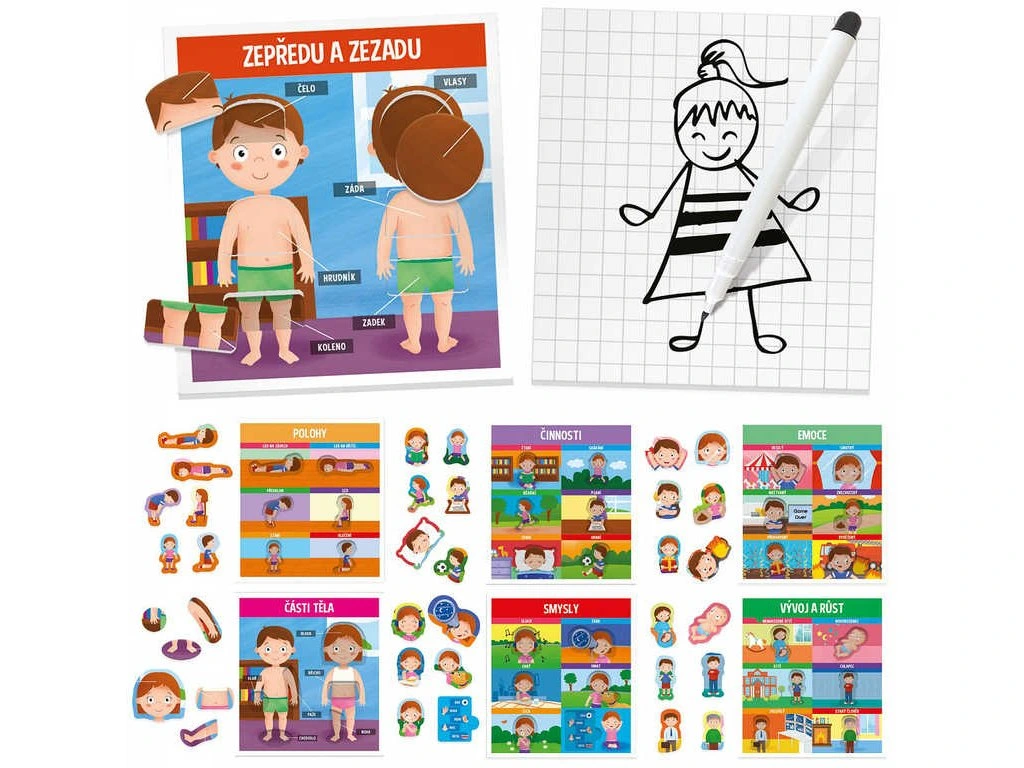 Obsah balení: 7 tabulek „Objevujeme lidské tělo" v českém jazyce, 42 tvarovaných výseků, prázdná tabulka, mazatelné pero