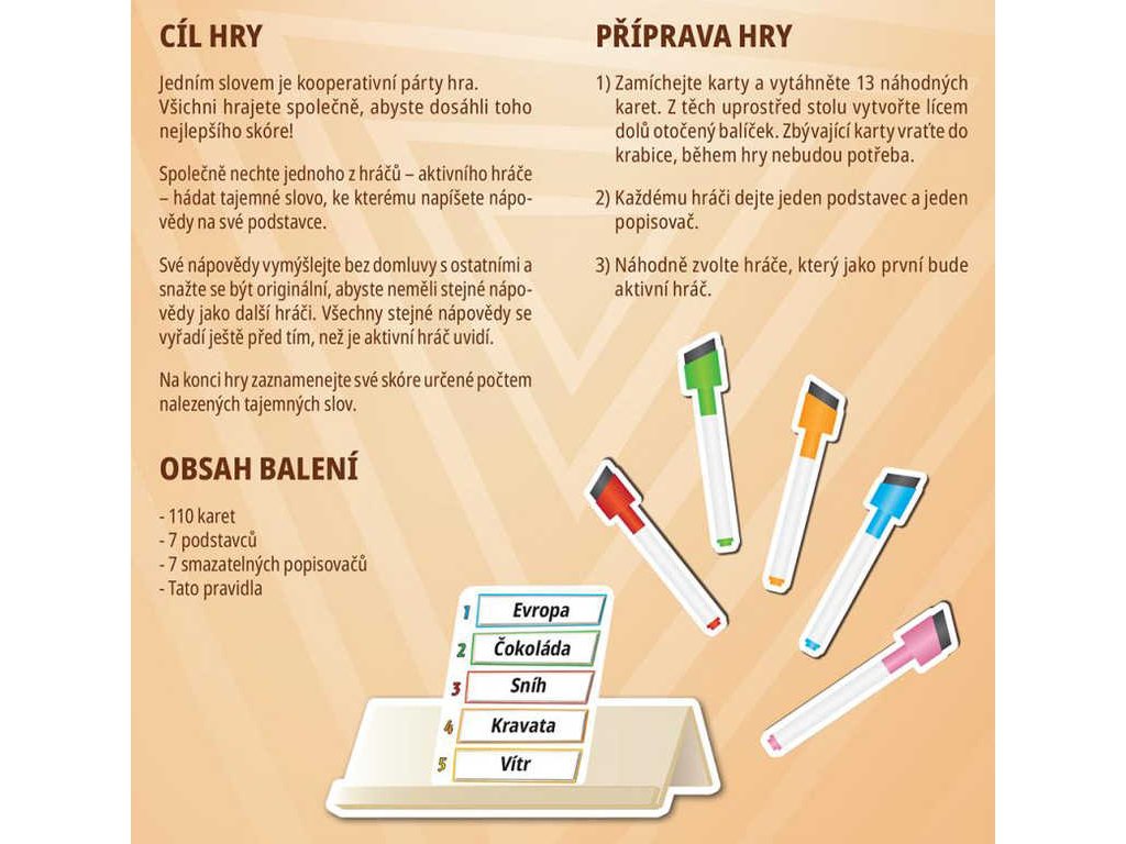 Jeden z hráčů ve hře hádá tajemné slovo, ke kterému napíšete jednoslovné nápovědy.