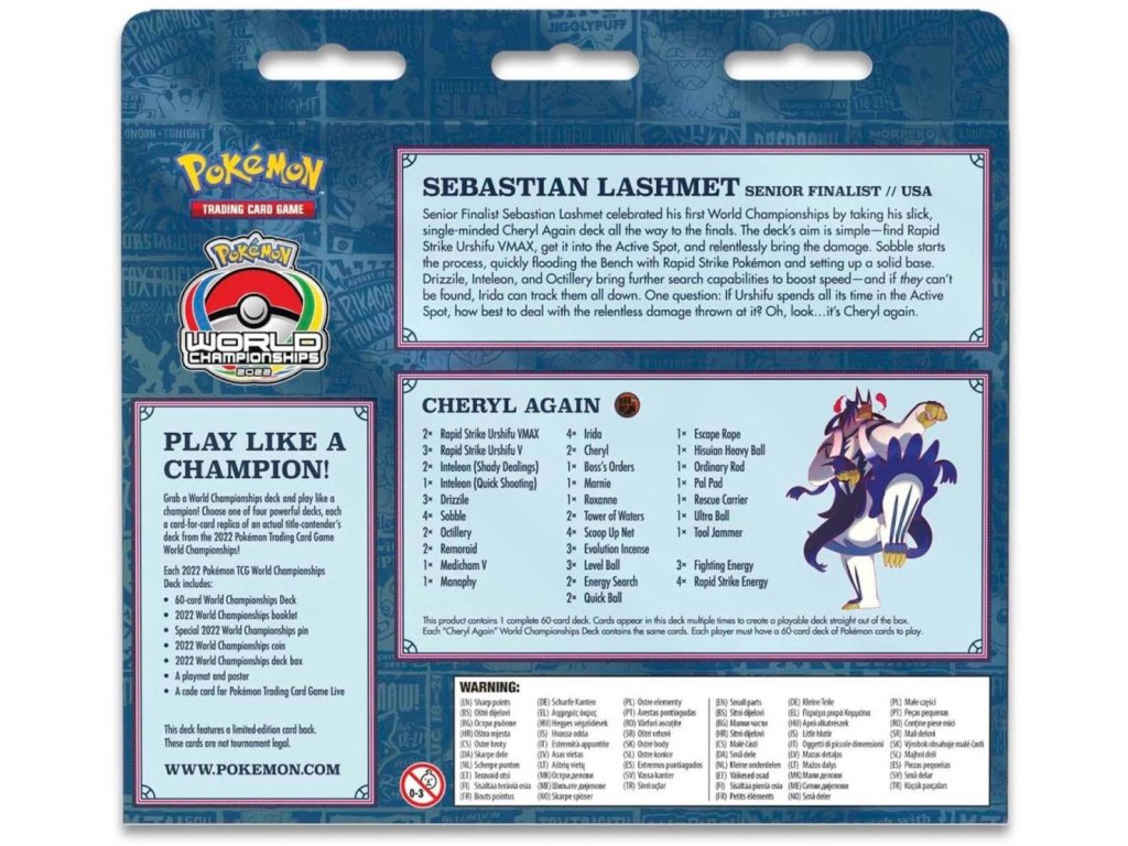 2) Balíček hráče Sebastian Lashmet, který vyhrál mistrovství v Pokémon TCG 2022 v kategorii senior, nese název Cheryl again. Jedná se o deck zaměřený hlavně na mechaniku Rapid Strike, tudíž nesmí chybět Octillery nebo Inteleon s Quick Shootingem. Balení se specializuje na udělování poškození do soupeřovy lavičky a chránění té své. Tento balíček doporučujeme na vyzkoušení všem, kteří uvažují o turnajovém hraní.