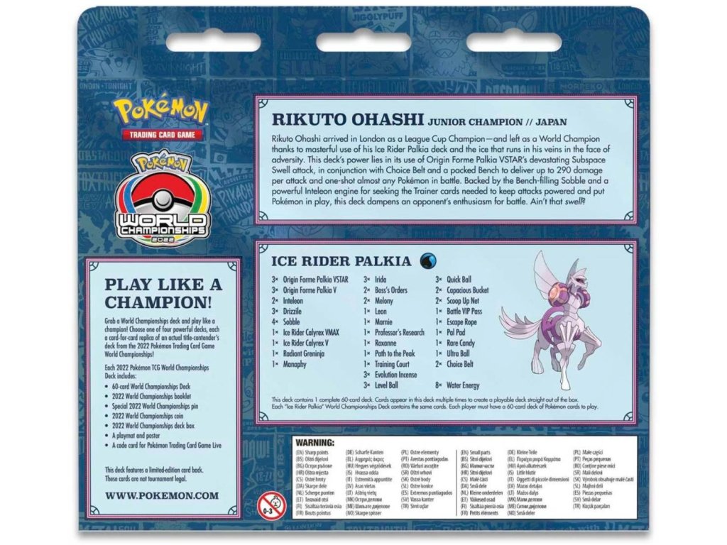 1) Rikuto Ohashi dorazil na mistrovství v Pokémon TCG 2022 s balíčkem okolo Ice Ridera Calyrexe VMAX a Origin Forme Palkií VSTAR. Skončil jako mistr světa v kategorii junior. Jedná se o čistě vodní balíček, který obsahuje nespočet různých techů a jiných trenérů, které umožňují hráči snadný průchod celým balíčkem tak, že si vždy najdete to, co zrovna potřebujete.