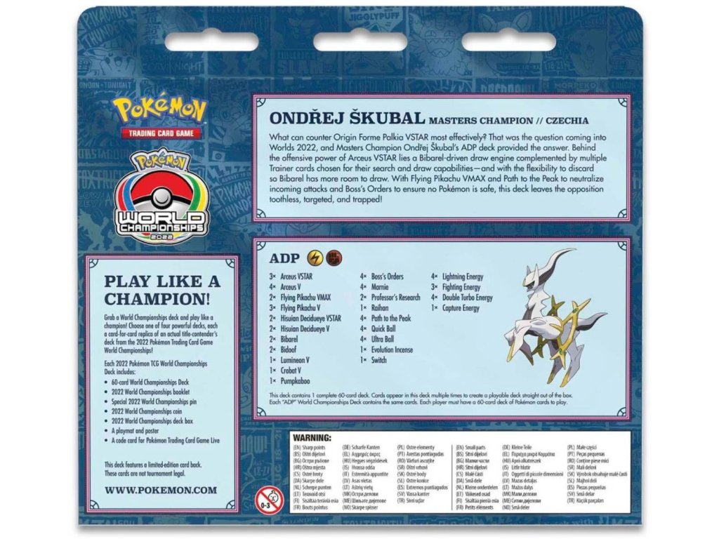 3) V roce 2022 se stal mistrem světa český hráč Ondřej Škubal. Zvítězil v kategorii Masters s balíčkem ADP, který obsahuje Arceuse VSTAR, Decidueye VSTER a Flying Pikachu VMAX. Spolu s Bibarelem, Lumineonem V a Crobatem V se jedná o jeden z nejsilnějších balíčků vůbec, který disponuje řadou hratelných trenérských karet a má tak odpovědi na nejrůznější typy balíčků od soupeřů.