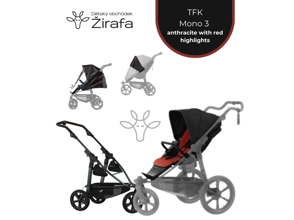 TFK Mono 3 Anthracite with red highlights 3v1 (2025) se sportovním sezením je agilní tříkolový kočárek, který nabízí nejvyšší úroveň stability a mobility pro aktivní rodiny. Jako rodinný obchůdek Žirafa oceňujeme jeho robustní konstrukci a XXL sedací plochu, která zajistí pohodlí vašemu dítěti od cca 6 měsíců až do konce kočárkového období.