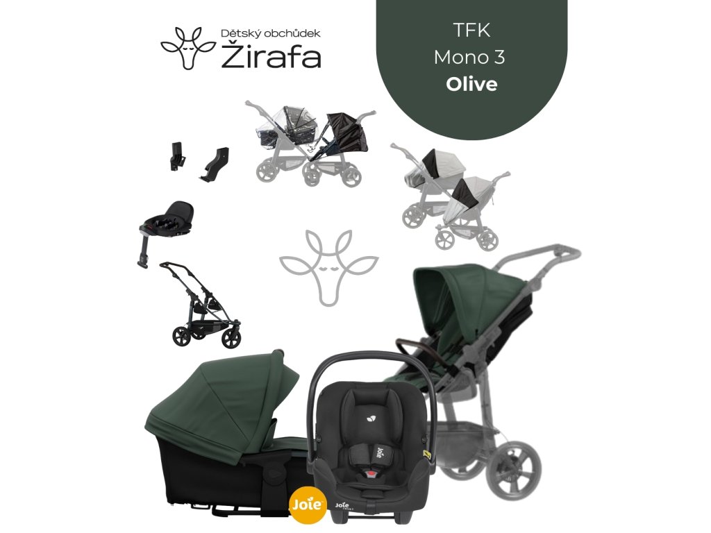 TFK Mono 3 Premium Olive 10v1 (2025) je agilní cestovní systém, který nabízí nejvyšší úroveň stability, mobility a bezpečí. Jako rodinný obchůdek Žirafa jsme tento set sestavili tak, aby vás spolehlivě provázel od prvních dnů v porodnici až do předškolního věku, a to jak v autě, tak v nejnáročnějším terénu.