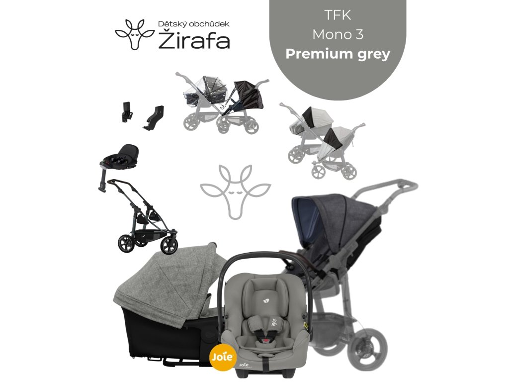 TFK Mono 3 Premium grey 10v1 (2025) je agilní cestovní systém, který nabízí nejvyšší úroveň stability, mobility a bezpečí. Jako rodinný obchůdek Žirafa jsme tento set sestavili tak, aby vás spolehlivě provázel od prvních dnů v porodnici až do předškolního věku, a to jak v autě, tak v nejnáročnějším terénu.