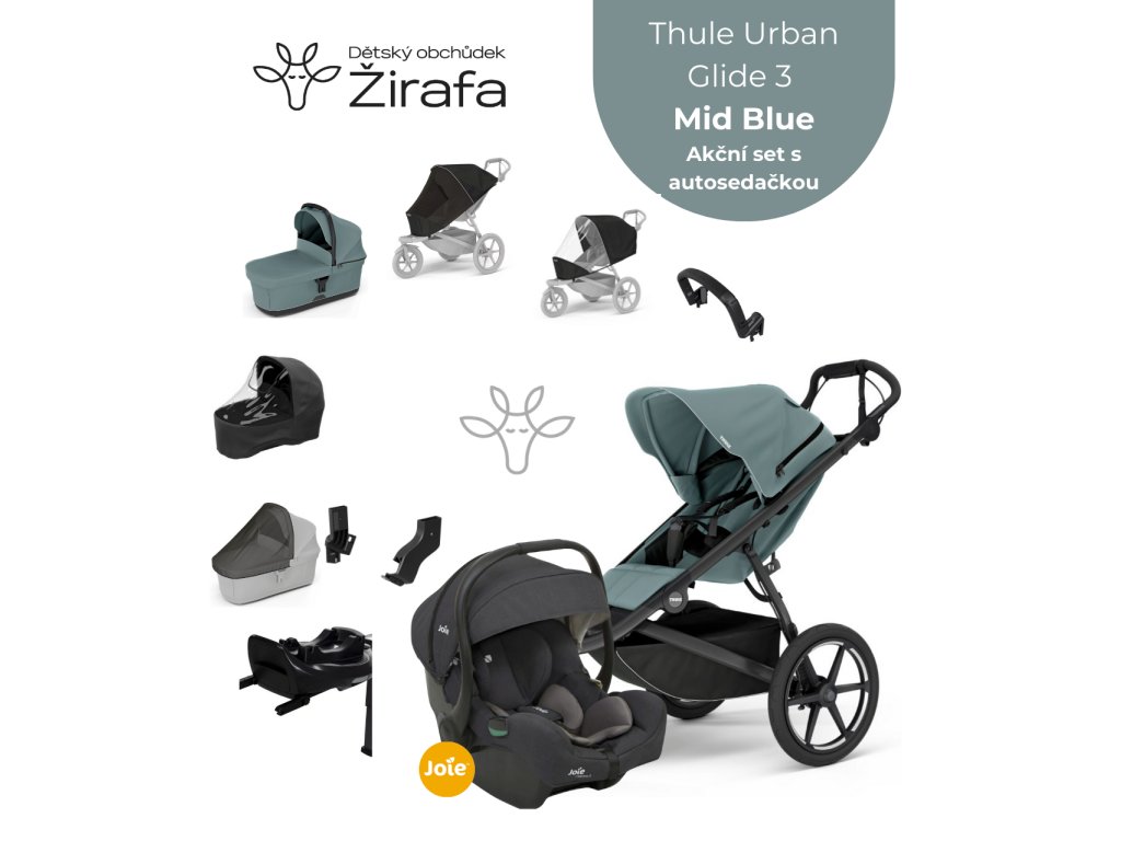 Akční set Thule Urban Glide 3 Mid Blue Magnetic Buckle + korbička + madlo + 2x pláštěnka + 2x moskytiéra + autosedačka + báze 2025