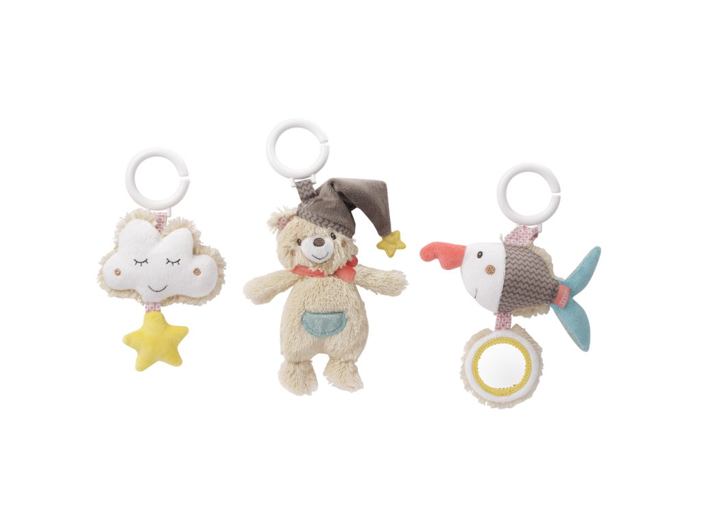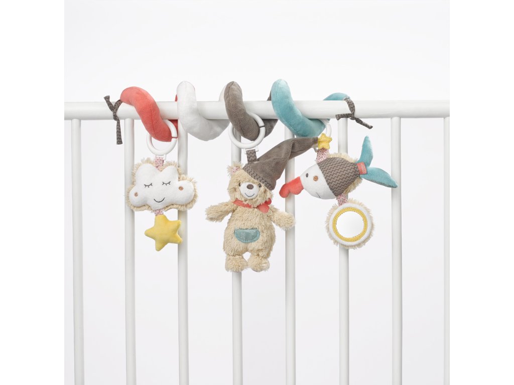 Barevná, plyšová spirála je příjemná na dotek a díky zavěšeným hračkám vybízí děti k objevování nových podnětů. Stimuluje jejich smysly a poskytuje jim zábavu. Na spirále jsou tři veselé přívěsky ve tvaru mraku, medvídka a rybičky. Hračky na spirále jsou pohyblivé díky kroužkům a lze je individuálně měnit.