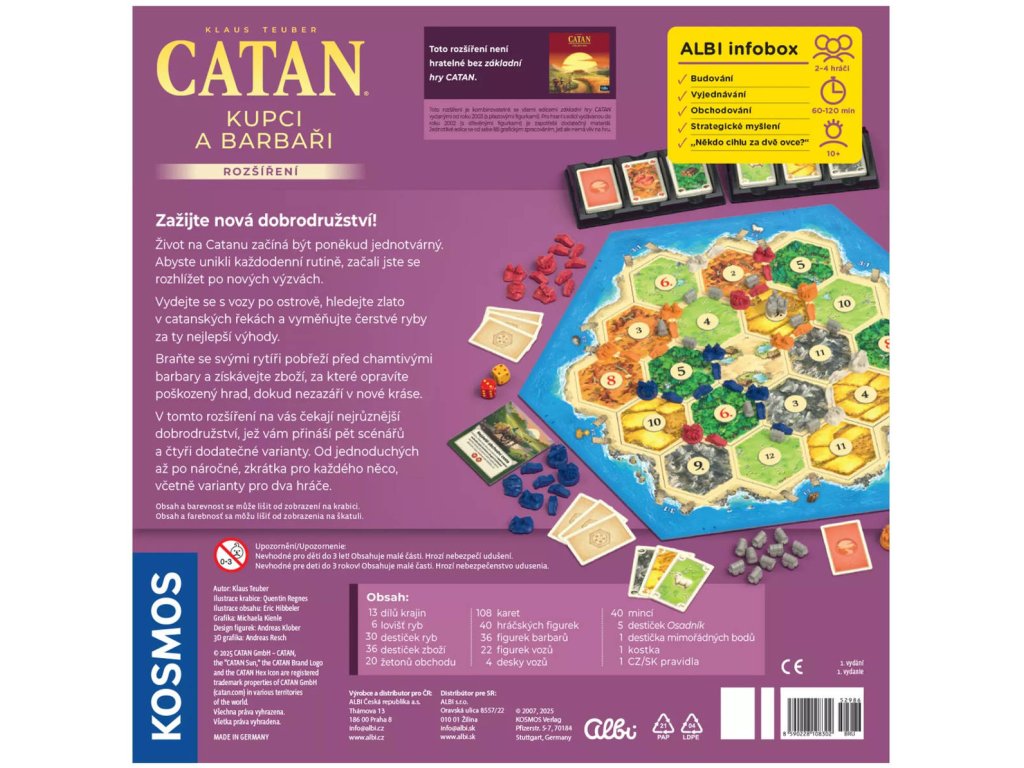 Kupci a barbaři jsou rozšířením společenské hry Catan - Osadníci z Katanu. Přinášejí do hry 5 nových napínavých scénářů. Nechybí ani 4 různé varianty hraní pro zpestření každé hry, včetně varinaty pro dva hráče.