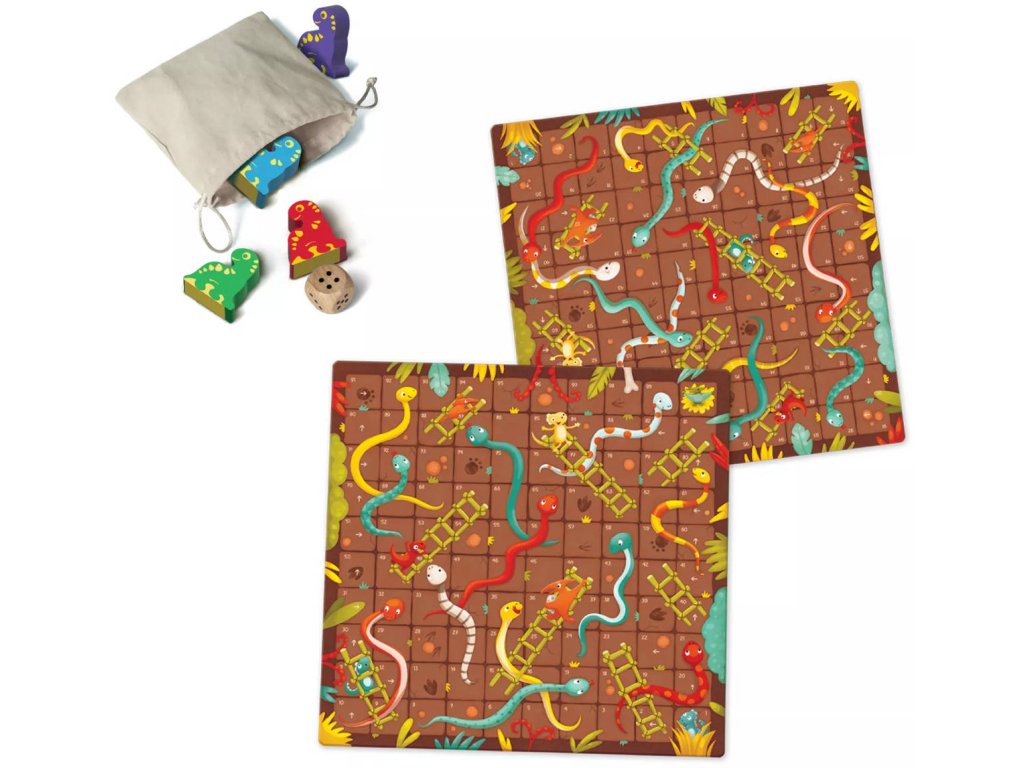 Klasická stolní hra, která zabaví děti i rodiče. Dostaňte svého dinosaura co nejrychleji nahoru na poslední políčko. Ale pozor na zrádné a kluzké hady, kteří vám tento nelehký úkol trošku ztíží. Naštěstí je možné zkrátit si cestu po žebřících. Roztomilé ilustrace, dřevěné figurky dinosaurů, oboustranný herní plán a jednoduchá pravidla zaručí zábavu pro malé děti od 4 let.