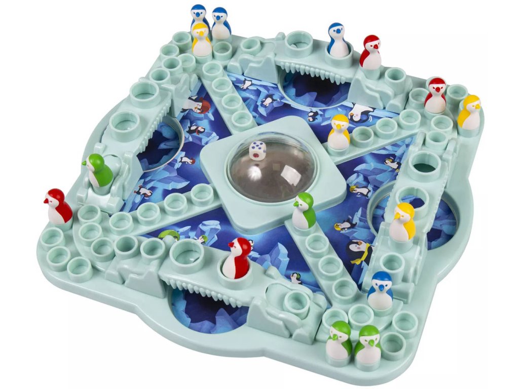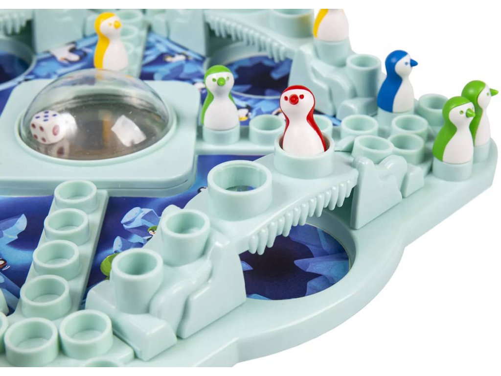 Zábavná rodinná hra pro 2–4 hráče, ve které se snažíte dostat všechny své tučňáky do domečku. Hráči se střídají v házení kostkou a posouvají své tučňáky po herní dráze. Pozor však na ledové můstky – můžete z nich spadnout a vrátit se zpět na start! Vyhrává ten, kdo jako první dovede všechny své tučňáky bezpečně do cíle. Ideální hra pro děti a dospělé, kde rozhoduje štěstí, strategie a dobrá nálada u jednoho stolu.