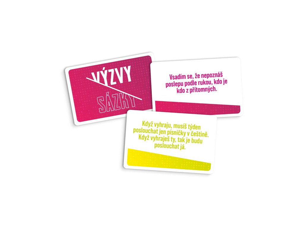 Obsah balení: 45 karet výzev, 45 karet sázek, 8 prázdných karet pro vlastní výzvy a sázky, pravidla