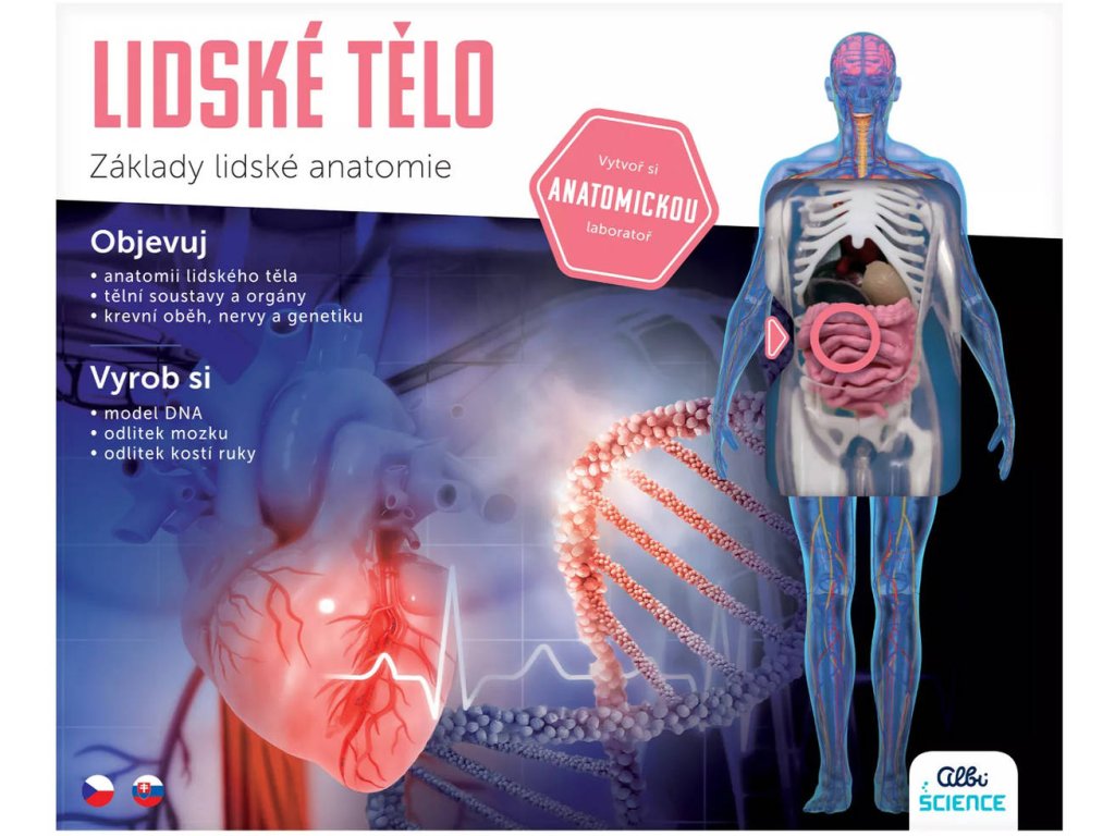 Sada Lidské tělo z edice Albi Science obsahuje průhledný model lidského těla s orgány, kostmi, svaly, nervy a krevními cévami. Nadzdvihněte poklop a pomocí pinzety a peánu opatrně postupně vyjímejte a prozkoumávejte jednotlivé orgány. Postupujte podle plnobarevné příručky k objevování a seznamte se s úžasnými zajímavostmi o srdci, plících, ledvinách, mozku, trávicí soustavě a dalších! S dovedností chirurga postupujte podle podrobných pokynů, naskládejte orgány zpět tam, kam patří. Sestavený model můžete umístit na stojánek a vystavit ho na poličce. Sestavte si i model lidské DNA, odlijte si model lidského mozku a kostí ruky a pomalujte je dle přiloženého návodu. Součástí sady je i brožura plná zajímavých informací a samozřejmě návod k celé sadě.