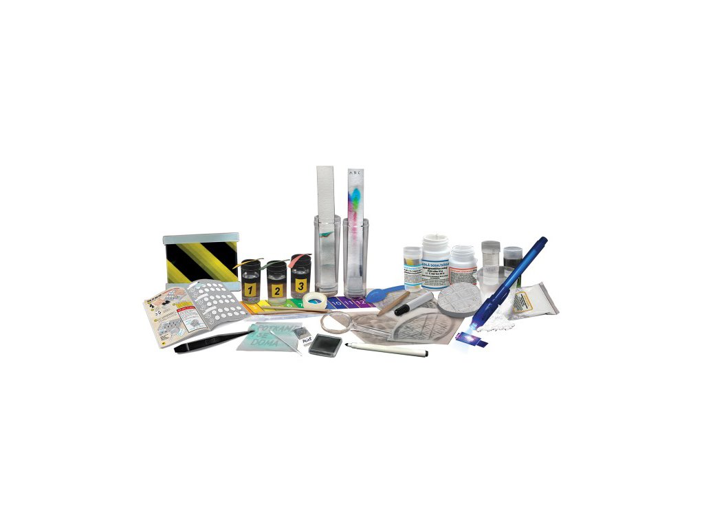 Balení obsahuje: vodové popisovače, lakmusové papírky, kukuřičný škrob, sádru, válec, kádinku, UV svítilnu a neviditelný fix (baterii nelze vyměnit), chromatografický papír, lžíci, míchátko, pauzovací papír, lžičky, pásku pro označení místa činu, karty na snímání otisku prstu a stěnu pro odlévání stop, pipetu, vatové tamponky a tyčinky, lupu, samolepicí štítky, razítkovací polštářek, pinzetu, samolepicí pásku, zkumavky, jedlou sodu, kyselinu citronovou, tužku, návod
