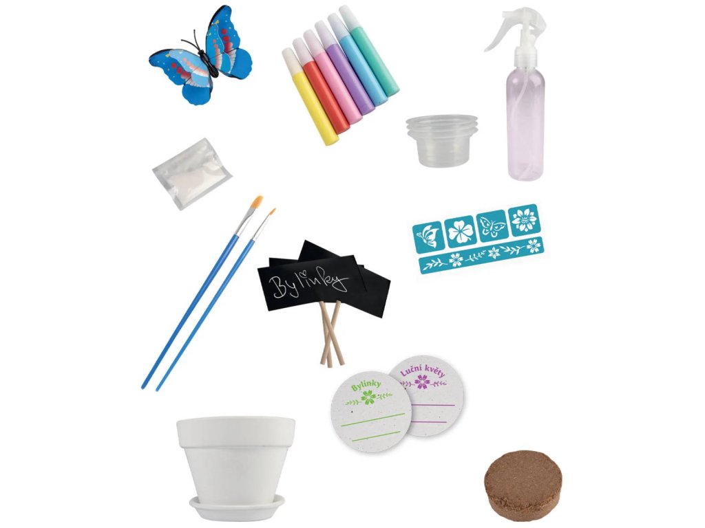 Sada Tvořivý květináč obsahuje: 1 keramický bílý květináč, 1 keramickou bílou podmisku, 6 akrylových barev (5 ml), 2 štětce, 1 sáček písku (20 g), 3 míchací kelímky, 3 špachtle, 1 prostorovou samolepku motýla, 5 samolepek se vzory, 3 papírové štítky, 3 špejle, 1 křídu, 1 rozprašovač, 2 rostoucí papíry se semínky, 1 sáček zeminy (0,5 l), návod