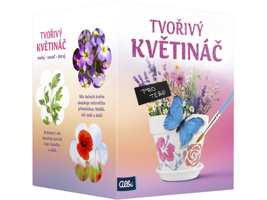 Tvořivý květináč od Albi je krásná a jedinečná kreativní sada, se kterou si děti mohou vlastnoručně ozdobit keramický květináč pomocí malování i pískování, zasadit semínka a sledovat, jak jim pod rukama vzniká živá dekorace. Sada obsahuje vše potřebné – od výtvarných pomůcek až po zeminu a rostoucí papíry se semínky bylinek a lučního kvítí. Nechybí ani samolepkové šablony, 3D dekorační samolepka motýla a informační brožurka plná zajímavostí o rostlinkách. Ideální jako smysluplný dárek pro děti od 8 let, který rozvíjí zručnost, tvořivost, trpělivost, vztah k přírodě a podporuje radost z vlastnoručně vytvořeného díla.