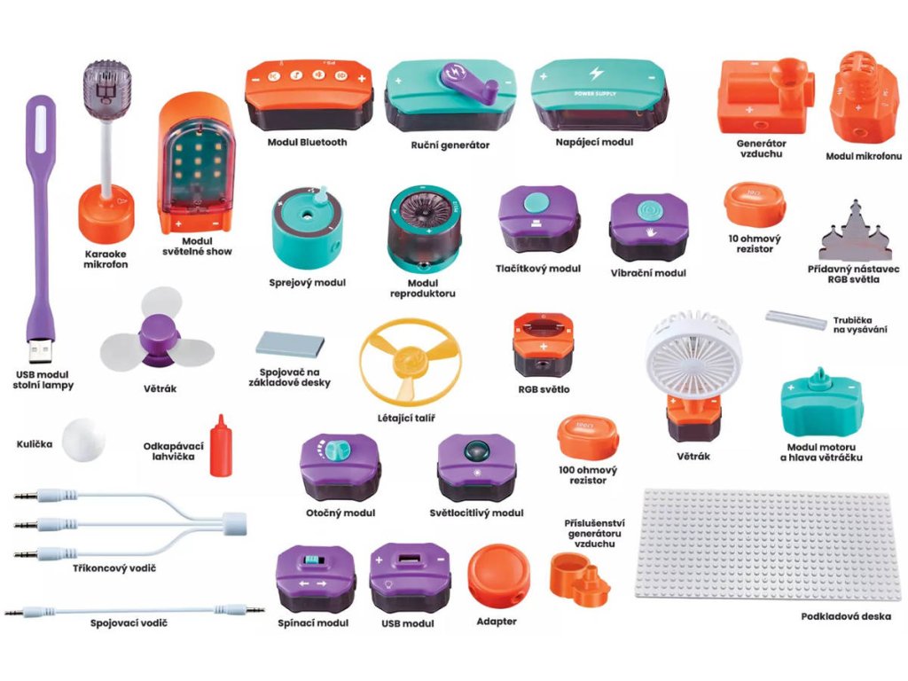 Balení obsahuje: USB lampu, mikrofon, modul Bluetooth, ruční generátor proudu, proudový modul, generátor vzduchu, nahrávací mikrofon, RGB stojánek, sprejový modul, modul klaksonu, klíčový modul, vibrační modul, RGB světlo, modul motoru, modul větráčku, 100 ohmový rezistor, 10 ohmový rezistor, příslušenství k modulu větráčku (2×), adaptér (2×), létající talíř, USB modul, světlocitlivý modul, rotační modul, přepínací modul, hlavu větráčku, jednoduchý vodič (10×), tříkoncový vodič (2×), kuličku (2×), podkladovou desku (3×), trubičku na vysávání, odkapávací lahvičku, spojovač na základové desky (6×), návod