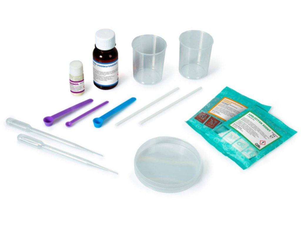 Obsah balení: lahvička Luminolu, sáček uhličitanu sodného (soda na praní), sáček hexakyanidoželezitanu draselného, sáček s lahvičkou peroxidu vodíku, malá fialová lžička, fialová a modrá lžíce, 2 pipety, 2 míchací tyčinky, 2 odměrky, petriho miska