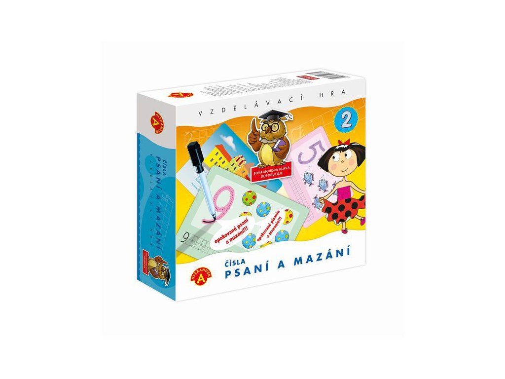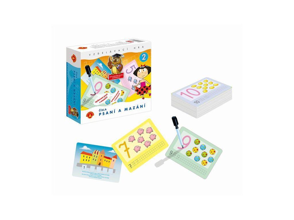 Hra se skládá z 28 motivů na 14 tabulkách a přiložené "mazací" fixy na psaní. Polovina motivů zobrazuje číslice 1-14. Každá číslice obsahuje pomocnou přerušovanou čáru, která pomáhá při kreslení jeho tvaru. Obrázky u čísel jsou výbornou pomůckou pro výuku počítání, protože jejich počet znázorňuje dané číslo. Každý obrázek lze z tabulky setřít houbičkou, která je umístěna na násadce fixu. Děti mohou opravovat chyby a používat tabulky opakovaně. „Psaní a mazání – Čísla“ je výborná zábava a výuka současně. Hračka je také dobrým tréninkem postřehu, soustředění, logického myšlení a asociací.