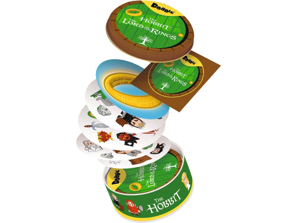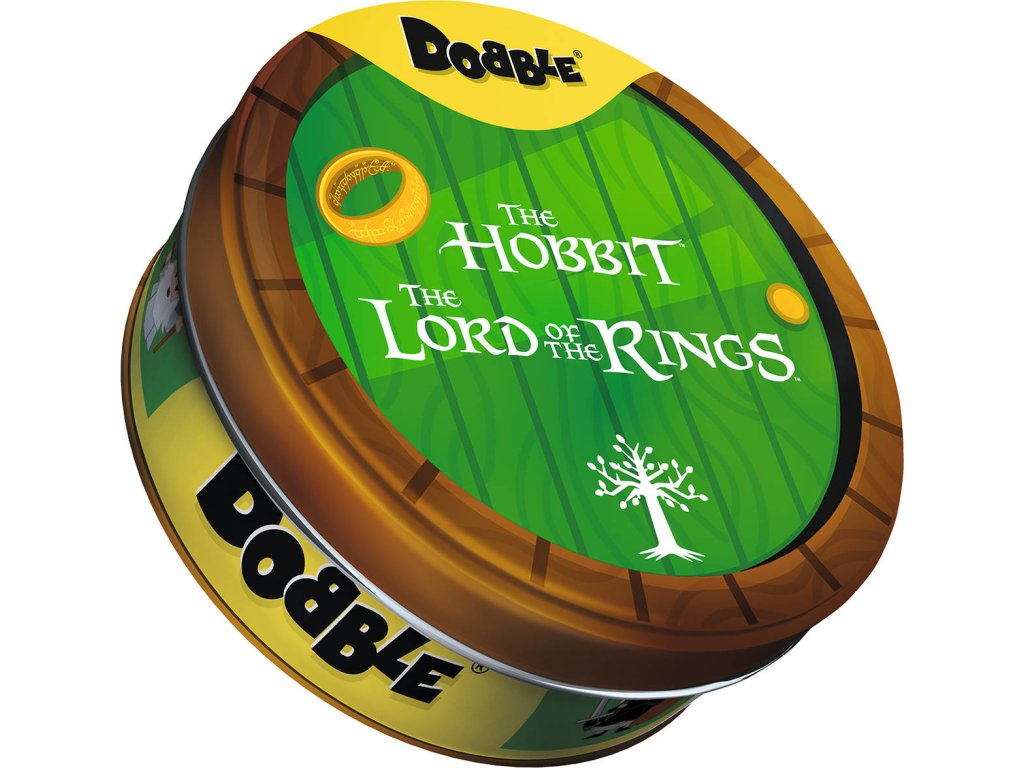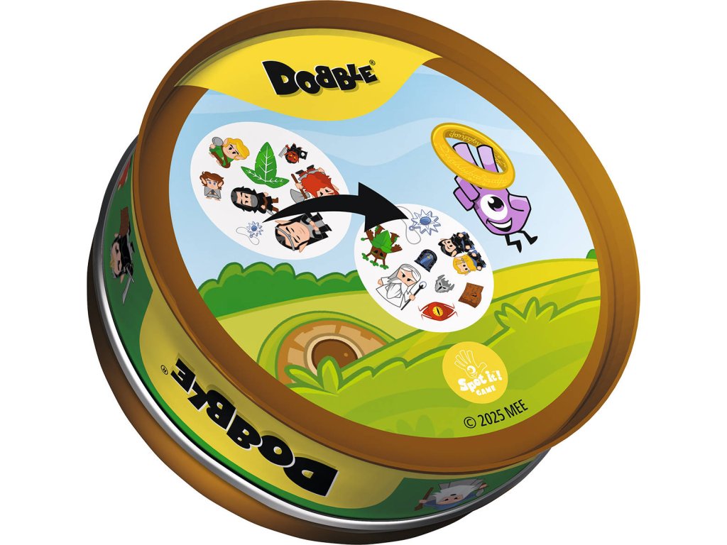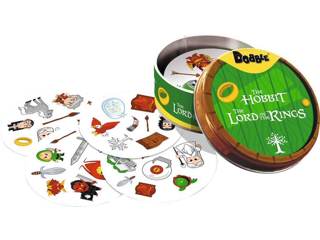 Společenská karetní postřehová hra Dobble: Výprava za jedním prstenem, v licenci Hobbit / Pán Prstenů. Hráči se snaží co nejrychleji najít jediný společný symbol mezi dvěma kartami. Kulaté karty v plechové krabičce.