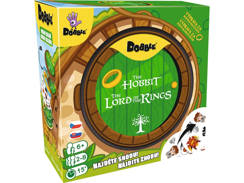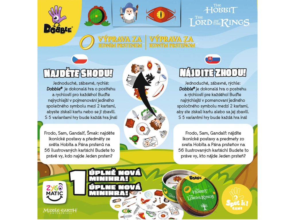 Populární hra Dobble s licencí Hobita a Pána prstenů. Frodo, Sam, Gandalf, Šmak: najděte ikonické postavy a předměty ze světa Hobita a Pána prstenů na 56 ilustrovaných kartách! Budete to právě vy, kdo najde Jeden prsten? Jednoduché, zábavné, rychlé: Dobble je dokonalá hra o postřehu a rychlosti pro každého! Buďte nejrychlejší v pojmenování jediného společného symbolu mezi 2 kartami, abyste získali kartu nebo se jí zbavili. S 5 variantami hry bude každá hra jiná! Obsahuje 1 úplně novou minihru!