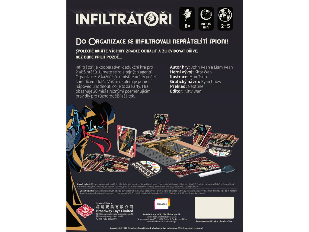 Infiltrátoři - společenská kooperativní dedukční hra. Do Organizace se infiltrovali nepřátelští špioni! Společně musíte všechny zrádce odhalit a zlikvidovat dříve, než bude příliš pozdě...
