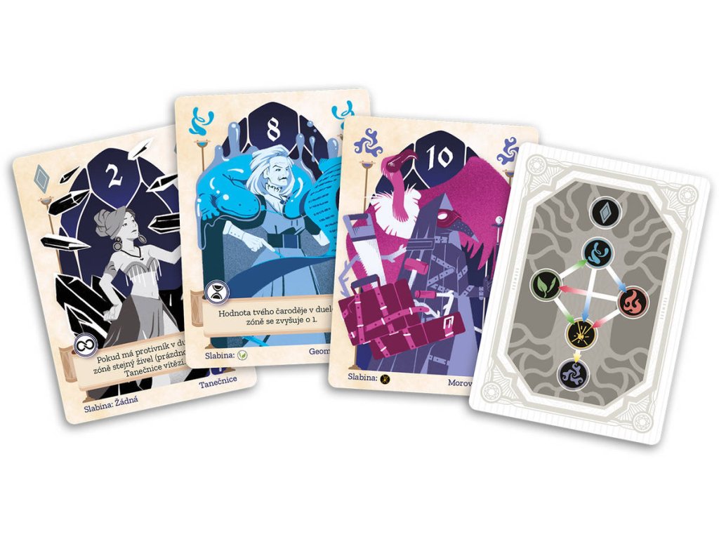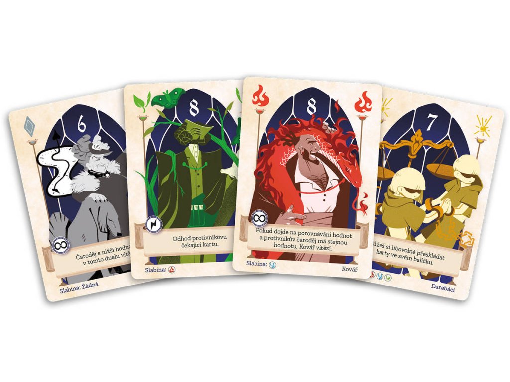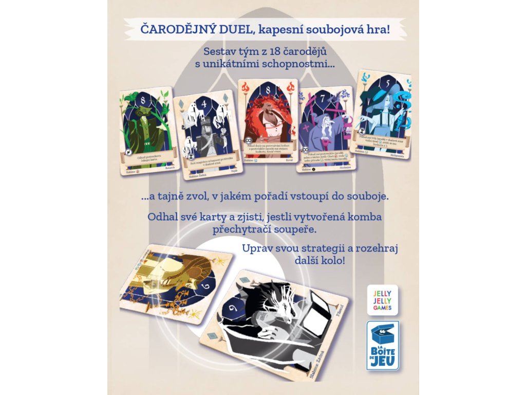 Dnes začíná magická soutěž pro čaroděje z celého světa, slavný Čarodějný duel! Jakožto vládce musíte ve své říši najít 6 výjimečných čarodějů, kteří budou tvořit váš tým, a rozhodnout o pořadí, ve kterém nastoupí proti soupeřům. Až budete s přípravami hotovi, zbývá vám už jen věřit ve svou strategii a schopnosti čarodějů, kteří se před vašimi zraky utkají v duelech. Sestavte neporazitelný tým a zazařte v turnaji, který se koná jen jednou za sto let. Ať celý svět vidí, jakou má vaše království moc! Sestavte tým z 18 čarodějů s unikátními schopnostmi a tajně zvolte, v jakém pořadí vstoupí do souboje. Odhalte své karty a zjistěte, jestli vytvořená komba přechytračí soupeře. Upravte svou strategii a rozehrajte další kolo! Čarodějný duel se hraje na dvě vítězná kola (tj. maximálně 3 kola). První hráč, který získá 2 vítězné žetony, v turnaji vyhrává. Na začátku hry si každý hráč sestaví balíček 6 karet, které bude v průběhu hry používat. Každé kolo odehrajete pomocí svých 6 karet čarodějů, kteří se vzájemně utkají jeden po druhém a poměří své magické schopnosti a hodnoty.