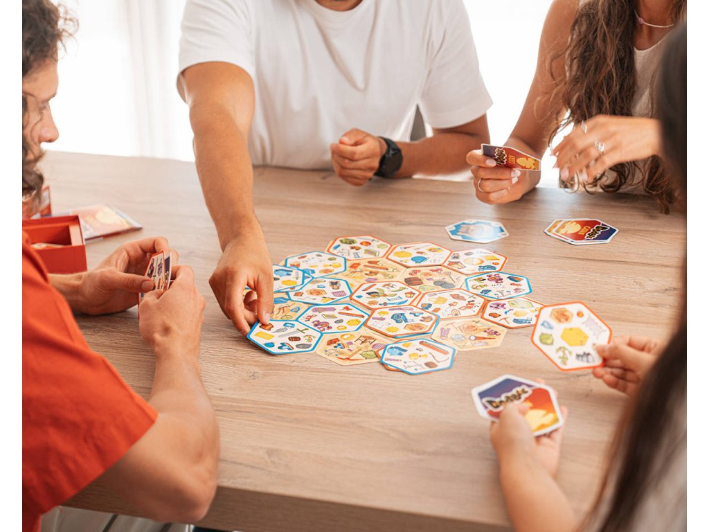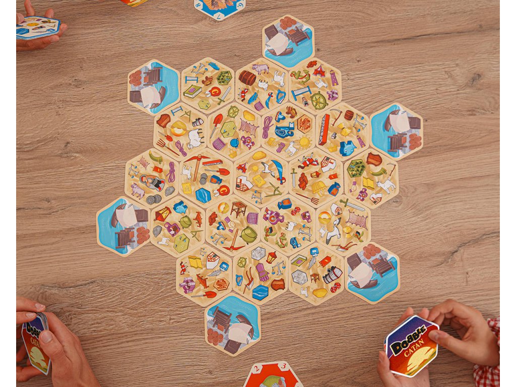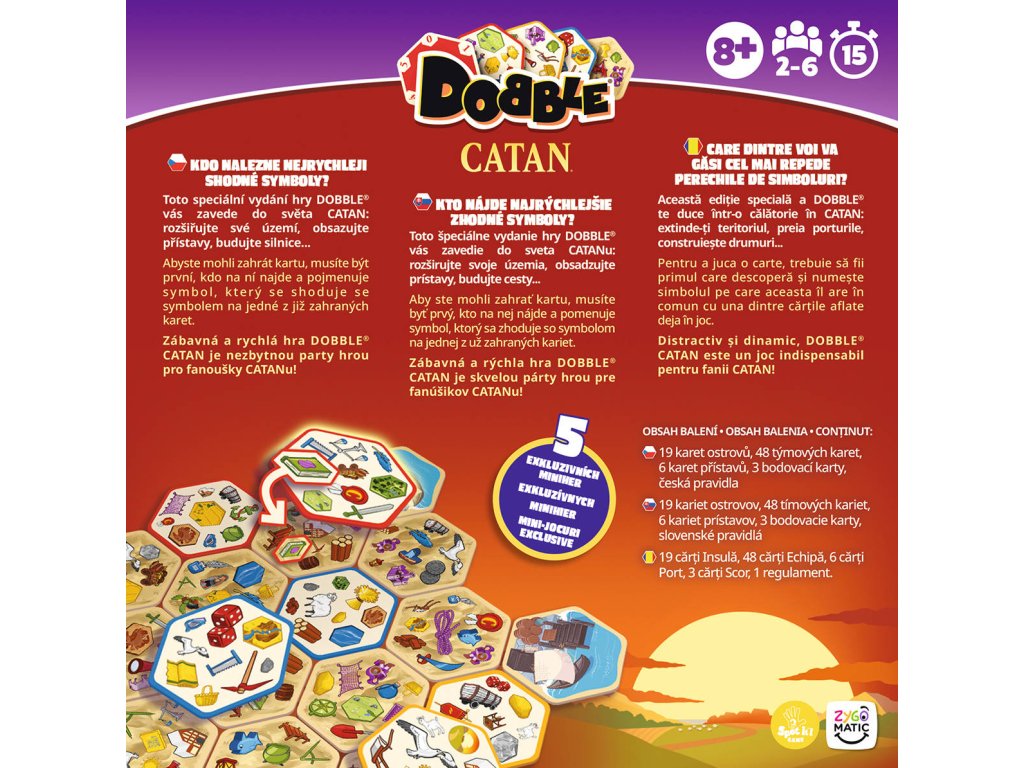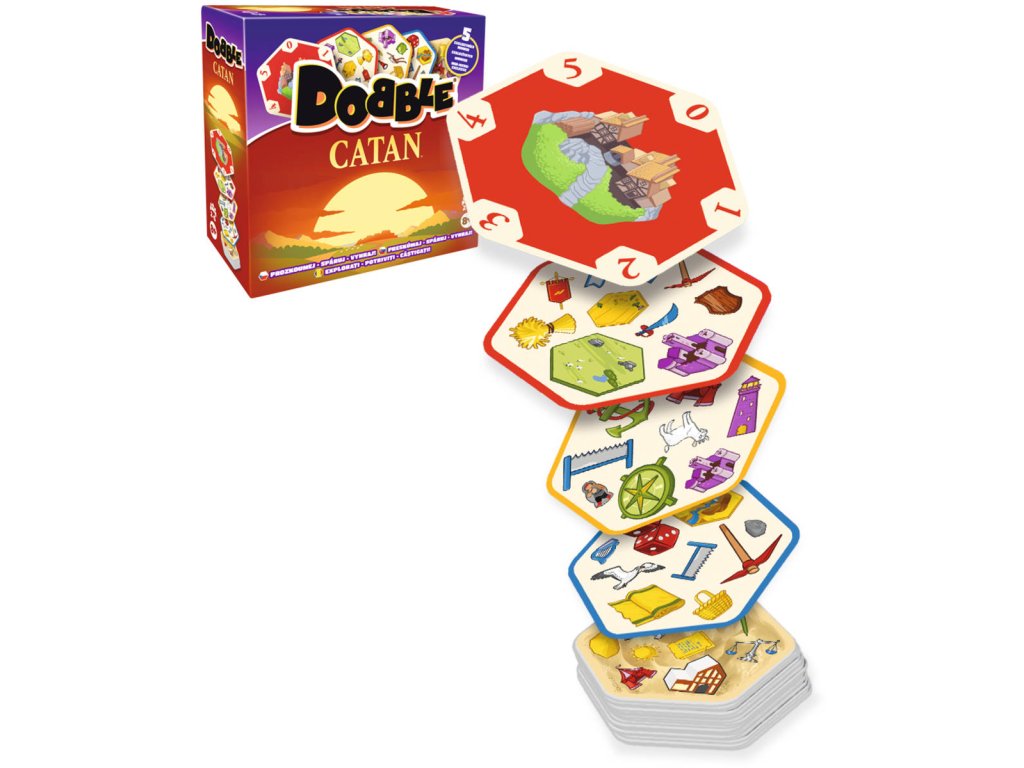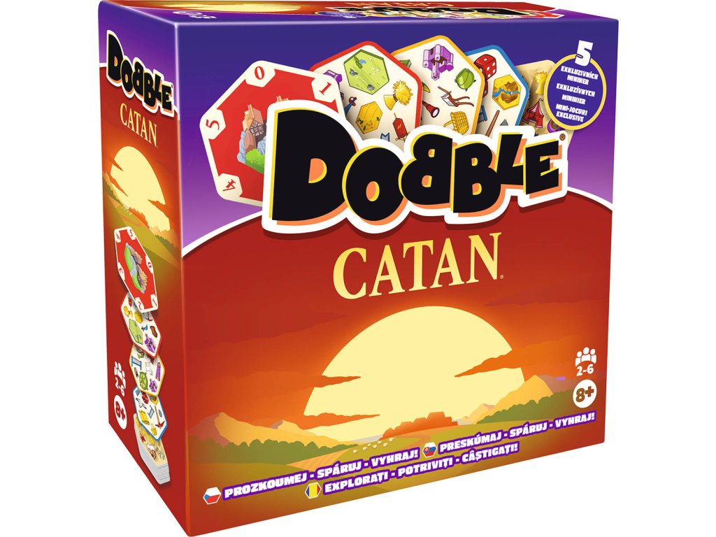 Toto speciální vydání hry DOBBLE vás zavede do světa CATAN: rozšiřujte své území, obsazujte přístavy, budujte silnice... Abyste mohli zahrát kartu, musíte být první, kdo na ní najde a pojmenuje symbol, který se shoduje se symbolem na jedné z již zahraných karet. Zábavná a rychlá hra DOBBLE CATAN je nezbytnou party hrou pro fanoušky CATANu! Obsahuje 5 exkluzivních miniher, díky nimž bude každá partie jiná!