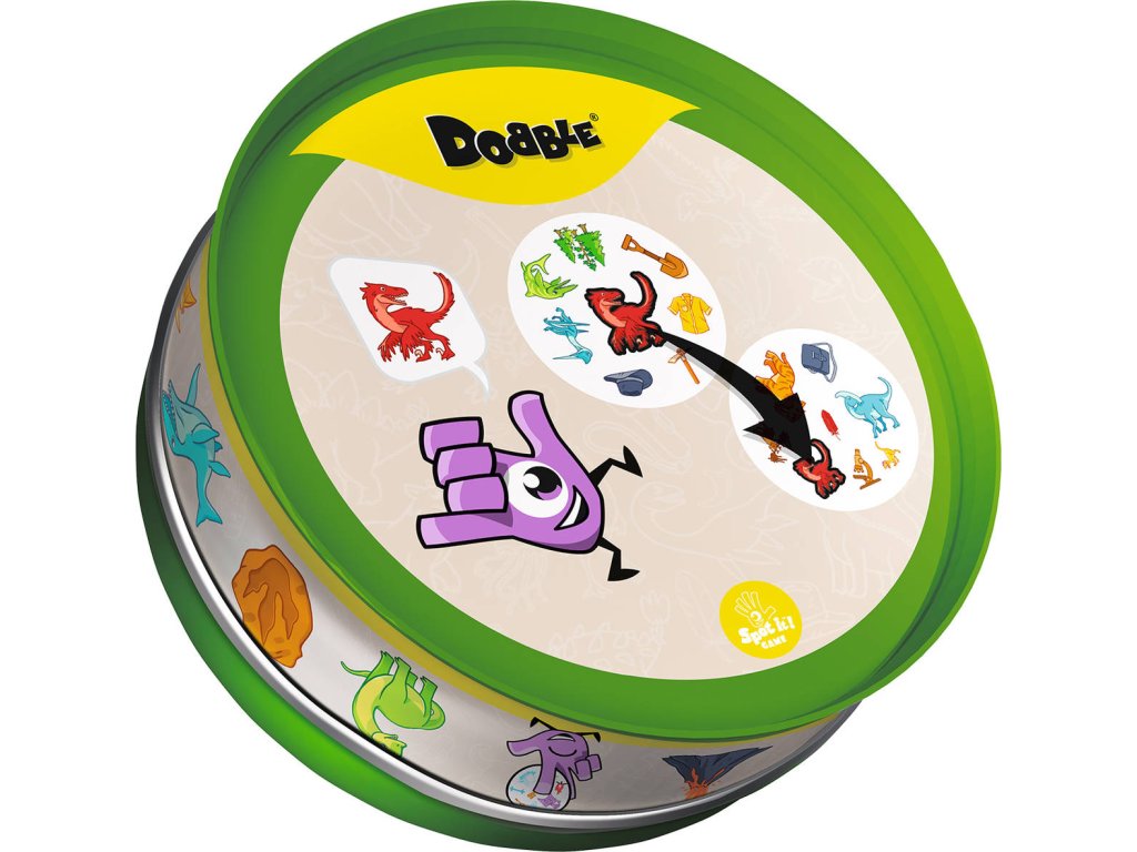Rychlost, postřeh, reflexy! Dobble Dino, to je 57 různých symbolů, 55 karet, 8 obrázků na kartě a každé dvě karty spolu mají společný jen jeden obrázek!