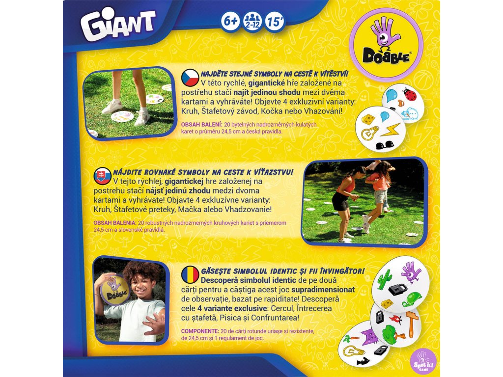 Dobble Giant vychází z klasické postřehoví hry Dobble, ale díky novým pravidlům a velkým kartám z ní dělá zábavnou in- i outdoorovou aktivitu. Dobble Giant obsahuje 4 unikátní minihry. Dvě z nich se hrají v týmech.