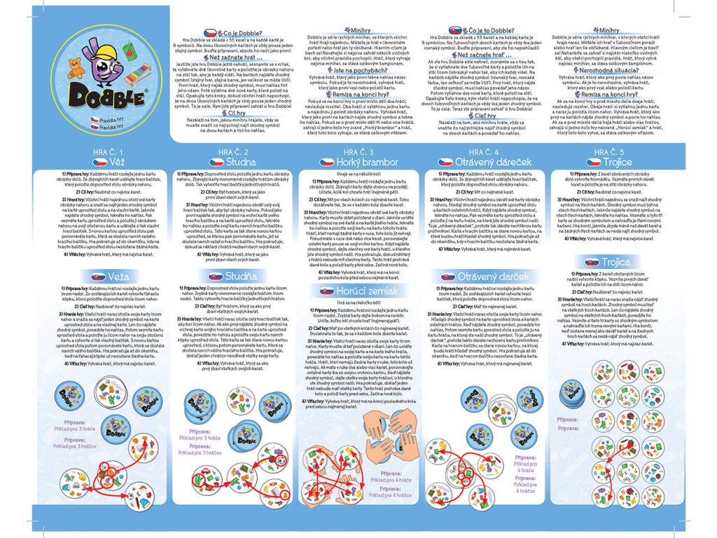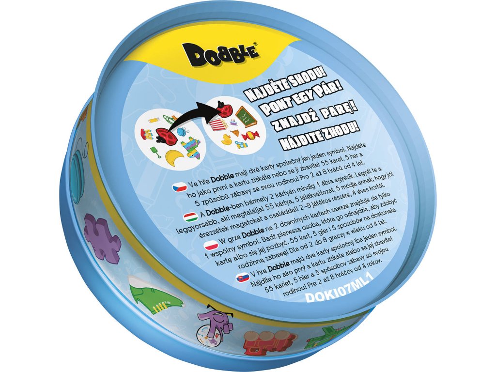 Rychlost, postřeh, reflexy! Buďte první, kdo najde shodný symbol na dvou kartách! Dobble, to je 57 různých symbolů, 55 karet, 8 symbolů na kartě a každé dvě karty spolu mají společný pouze jeden! Hra nabízí zcela unikátní zábavu. Hráči zde hledají dva stejné symboly na kartách při různých verzích hry (v pravidlech je popsáno celkem 5 her). Super jsou kulaté karty i jednoduchá pravidla, vysvětlená doslova za pár sekund. Plechová krabička zaručuje bezpečí karet a jednoduše umožňuje mít hru vždy u sebe. Vyzkoušejte i vy postřehový fenomén Dobble a jistě budete překvapeni, jak i tak jednoduchá hra může být zábavná!