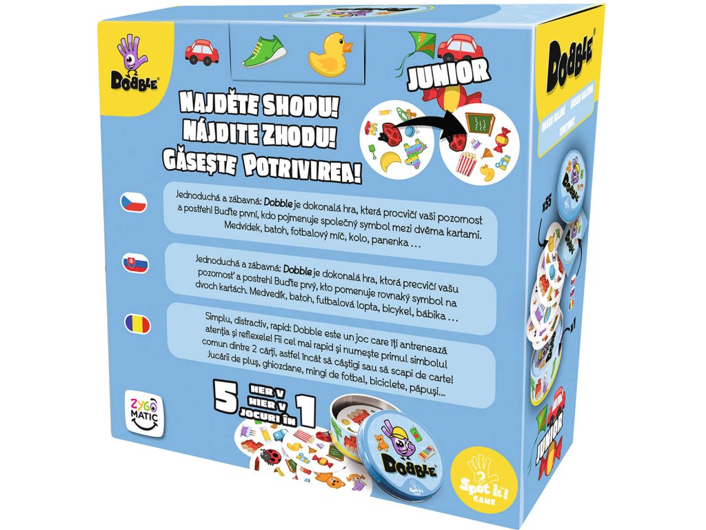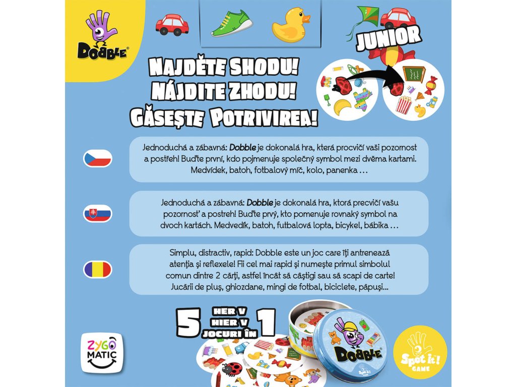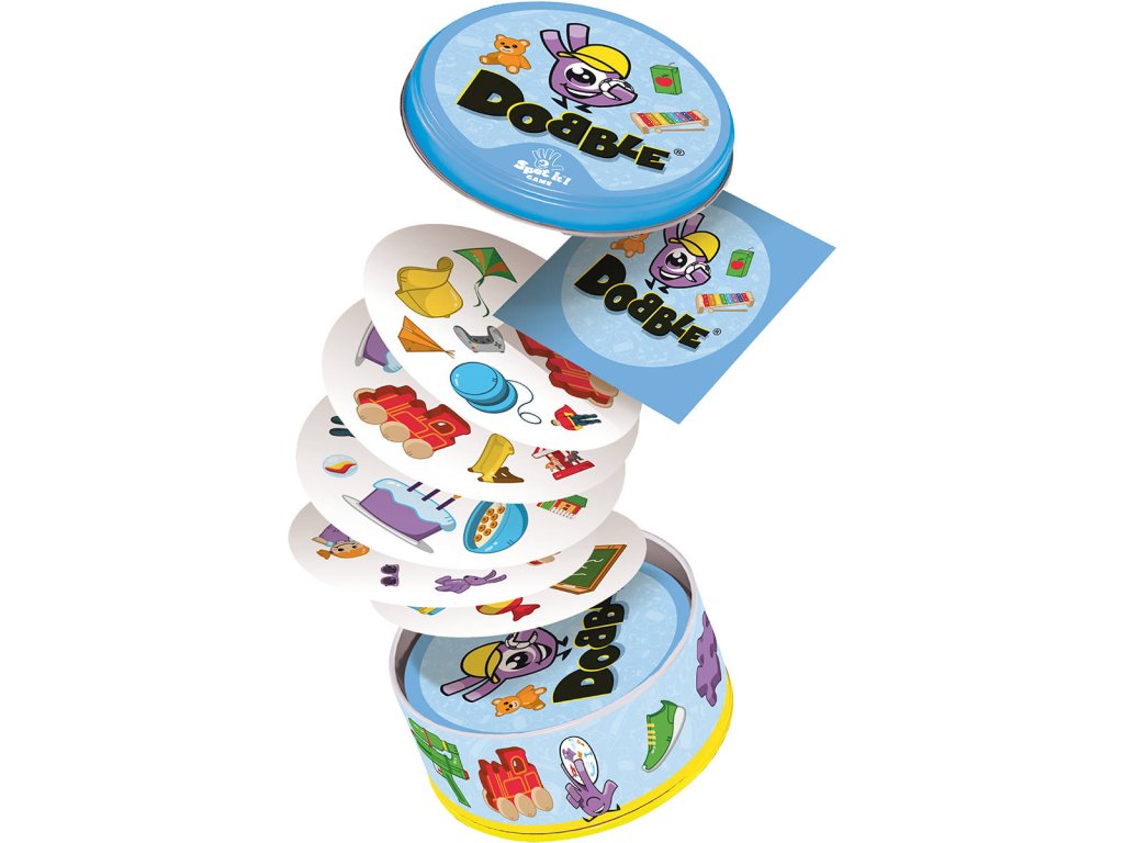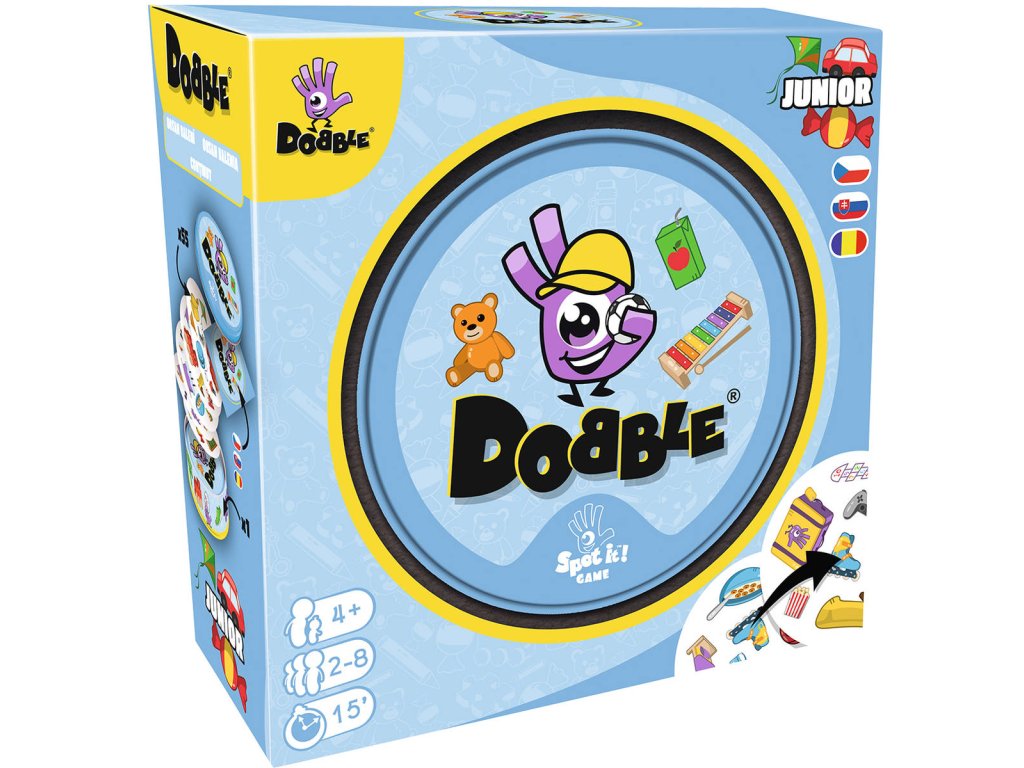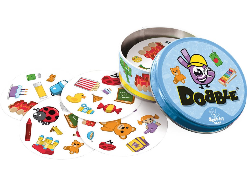 Společenská karetní postřehová hra Dobble Junior. Hráči se snaží co nejrychleji najít jediný společný symbol mezi dvěma kartami. 55 kulatých karet v plechové krabičce.