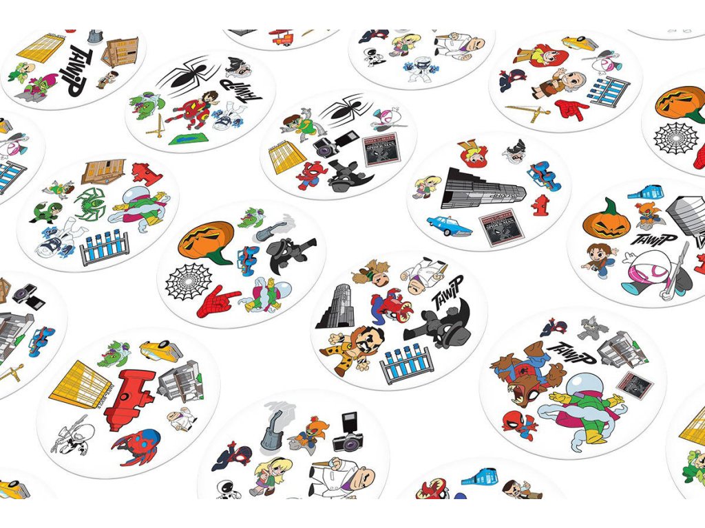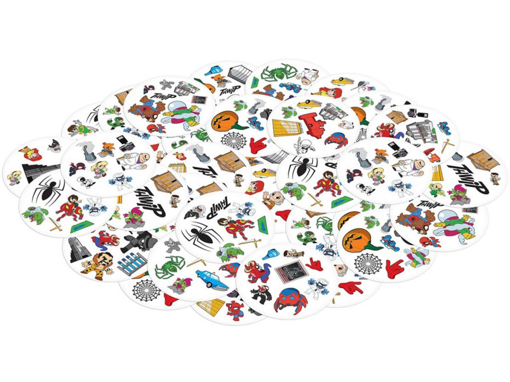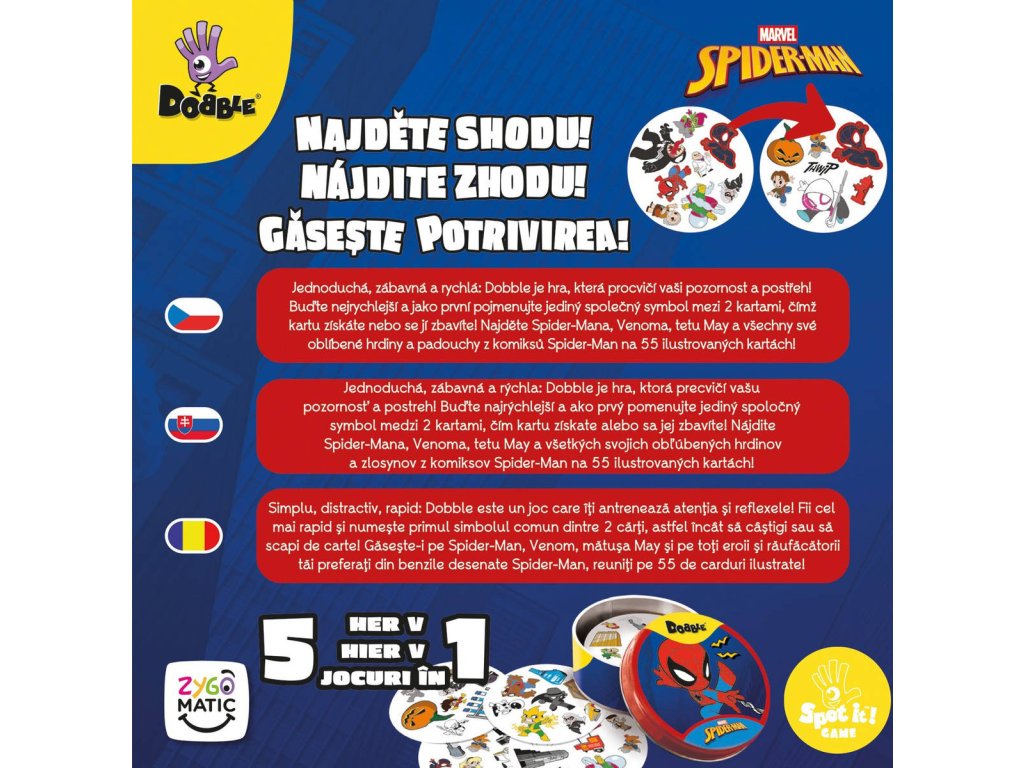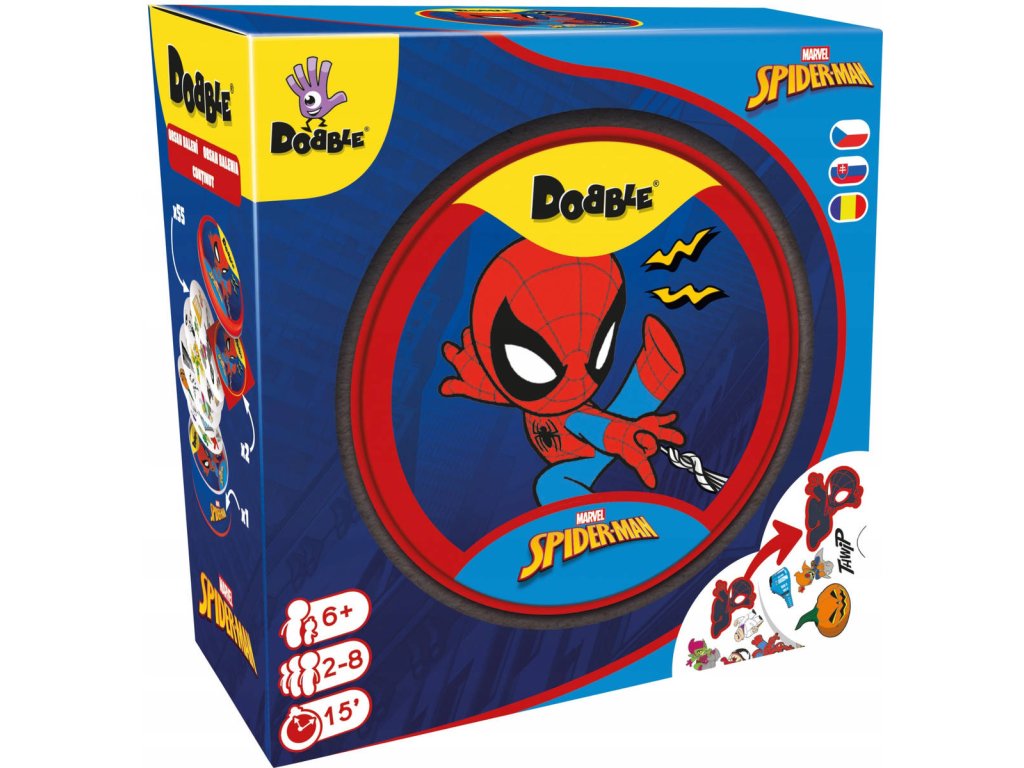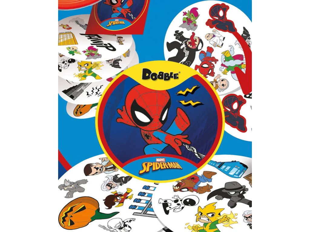 Rychlost, postřeh, reflexy! Dobble Spider-Man, to je 57 různých symbolů, 55 karet, 8 obrázků na kartě a každé dvě karty spolu mají společný jen jeden obrázek! Jednoduchá, zábavná a rychlá: Dobble je hra, která procvičí vaši pozornost a postřeh! Buďte nejrychlejší a jako první pojmenujte jediný společný symbol mezi 2 kartami, čímž kartu získáte nebo se jí zbavíte! Najděte Spidermana, Venoma, tetu May a všechny své oblíbené hrdiny a padouchy z komiksů Spider-Man na 55 ilustrovaných kartách!
