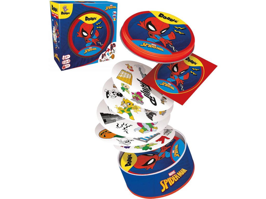 Populární společenská postřehová hra Dobble v licenci Spiderman, pro všechny milovníky pavoučího superhrdiny, v plechové krabičce.