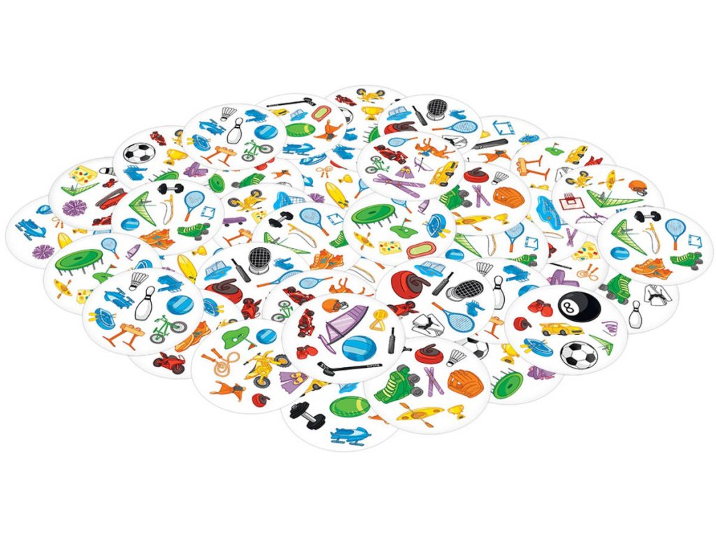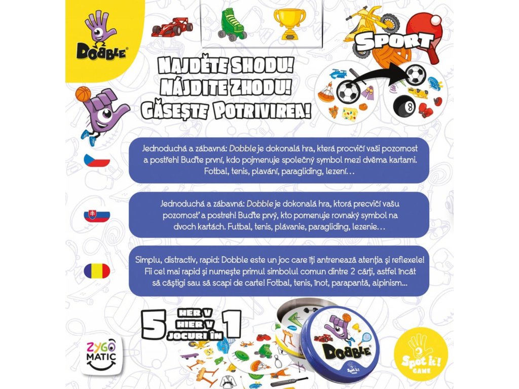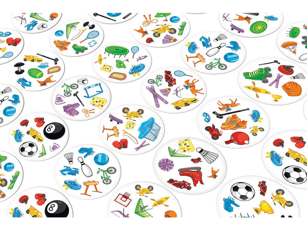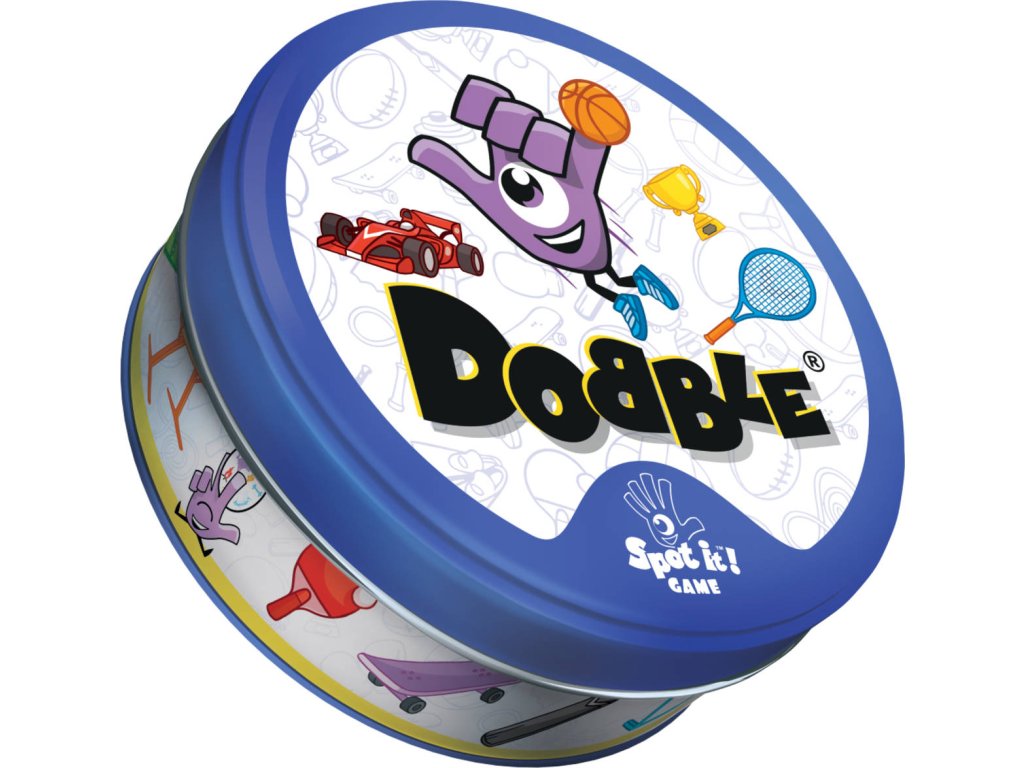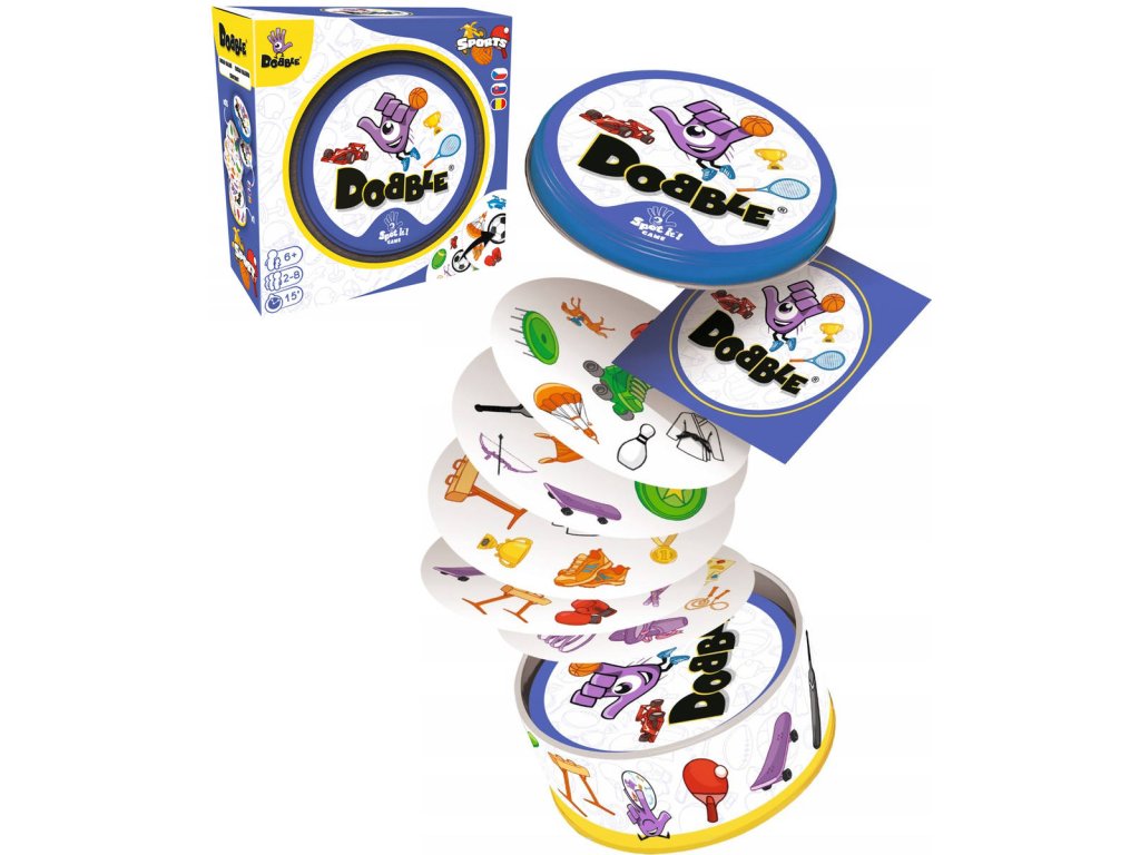 Rychlost, postřeh, reflexy! Dobble Sports, to je 57 různých symbolů, 55 karet, 8 obrázků na kartě a každé dvě karty spolu mají společný jen jeden obrázek! Postřehový bestseller Dobble vstupuje do světa sportu! Na každé kartě najdete 8 tematických obrázků. Máte rádi sport? Buďte první, kdo pojmenuje společný symbol mezi dvěma kartami. Fotbal, tenis, plavání, paragliding, lezení…