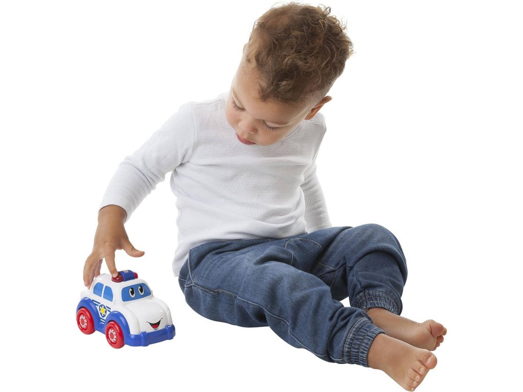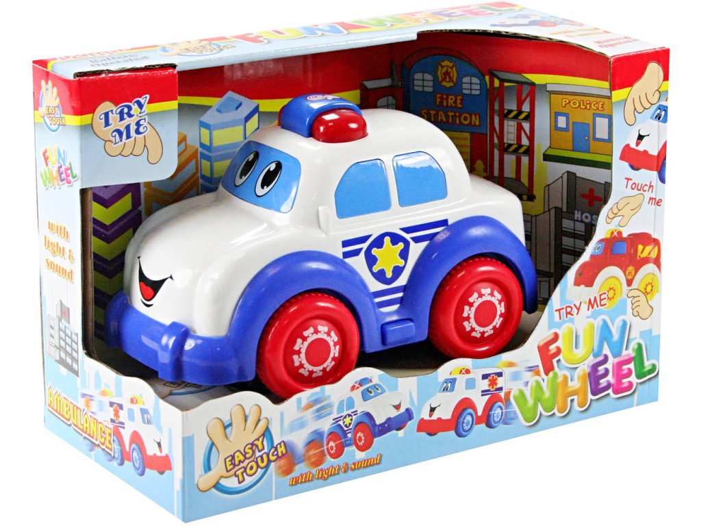 Veselé plastové policejní autíčko o velikosti 15cm, Policie s obličejem, pro nejmenší děti. Auto na baterie, se světlem a zvukem.