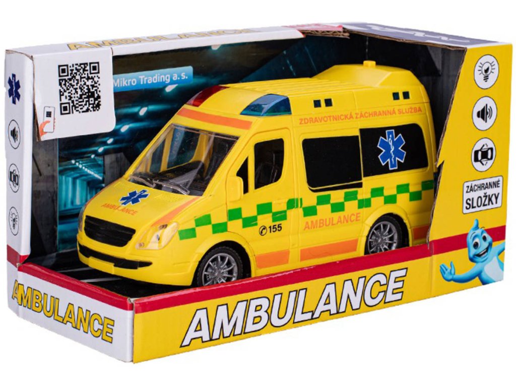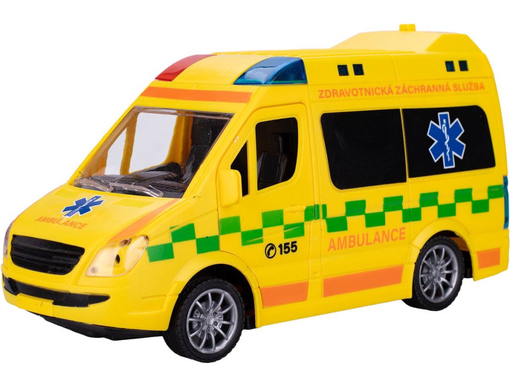Plastové auto žlutá ambulance o velikosti 22cm, zdravotnická záchranná služba s pohonem na setrvačník, hračka na baterie, se světlem a zvukem. Český design. Otevírací dveře.