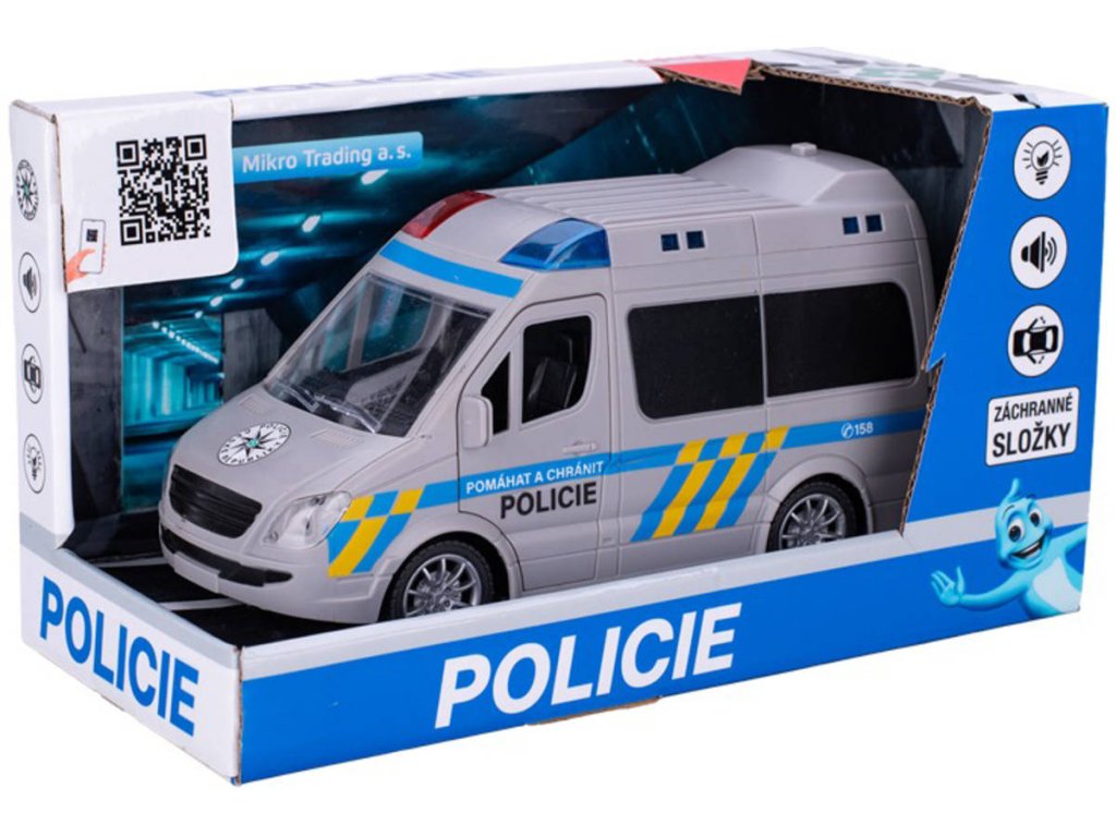Plastové policejní auto o velikosti 22cm, dodávka s pohonem na setrvačník, česká policie. Hračka na baterie, se světlem a zvukem. Český design policie CZ. Pomáhat a chránit. Otevírací dveře.