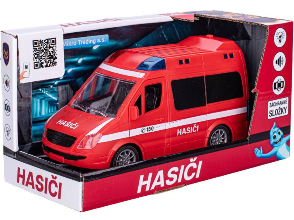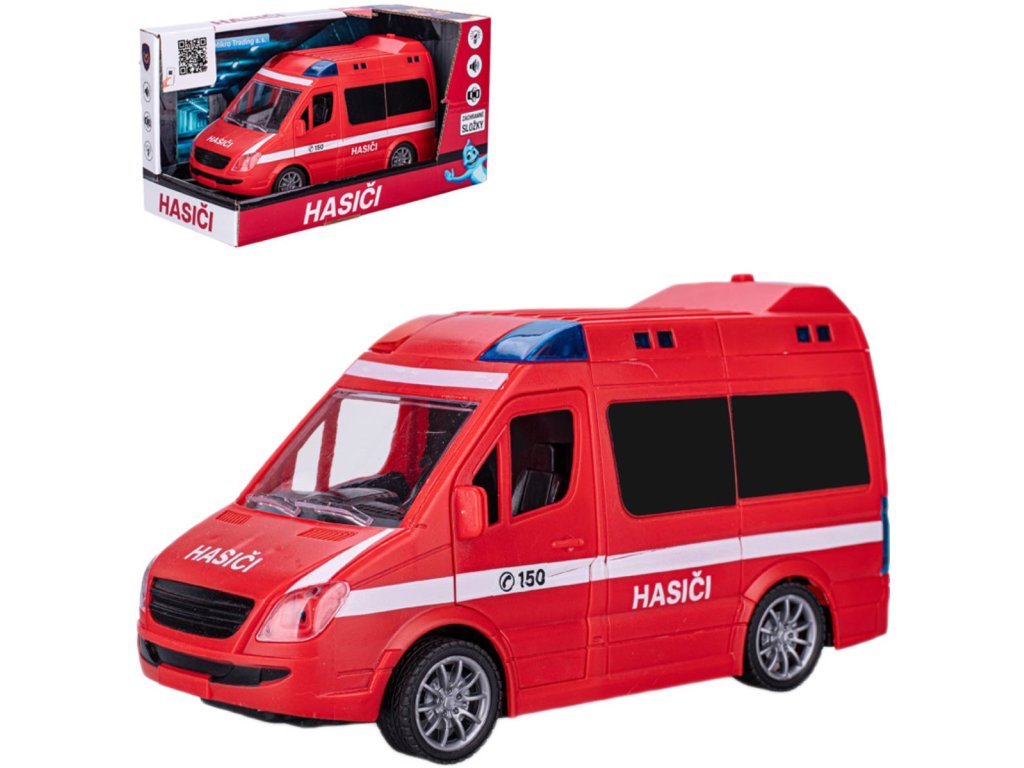 Červená hasičská dodávka, požární auto o velikosti 21,5cm, s pohonem na setrvačník, český design "Hasiči / 150". Hračka na baterie, se světlem a zvukem.