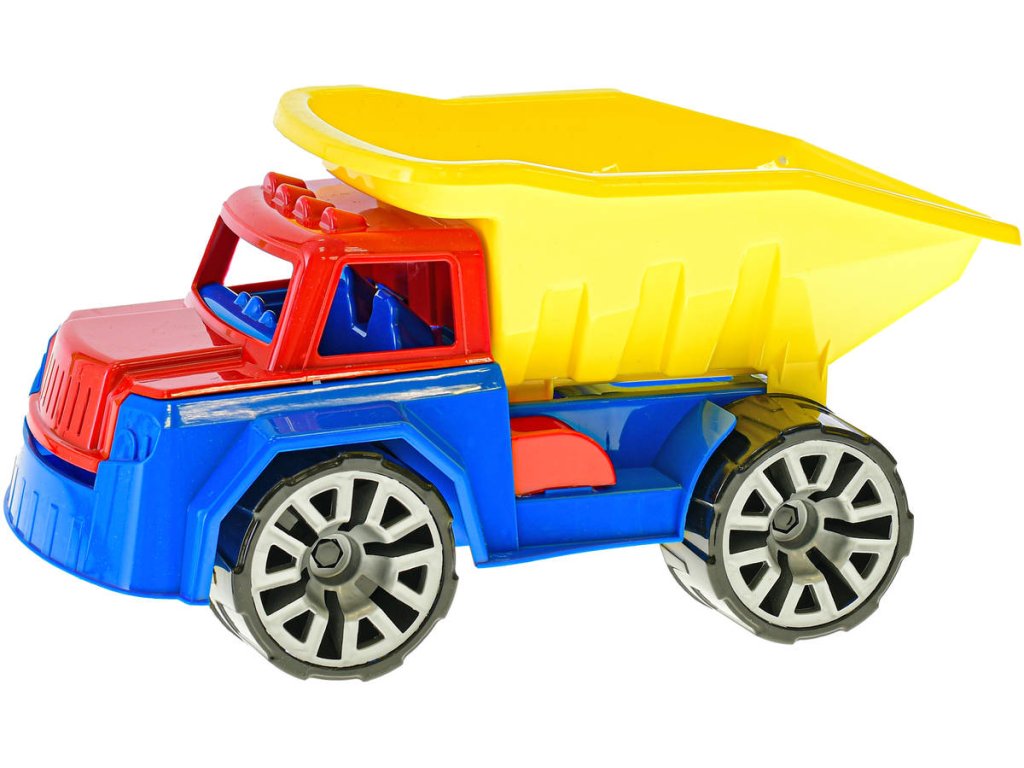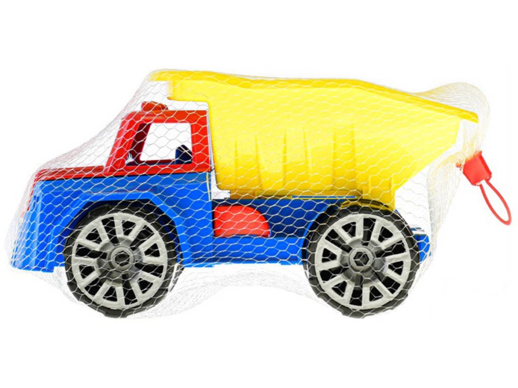 Nákladní barevné plastové autíčko s vyklápěcí korbou na písek. Velikost 29cm, velká kola, korba s pojistkou, lze vyklápět.