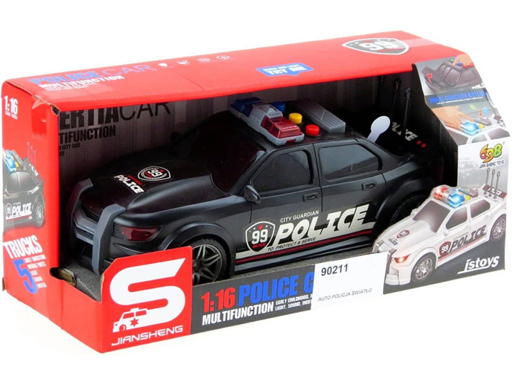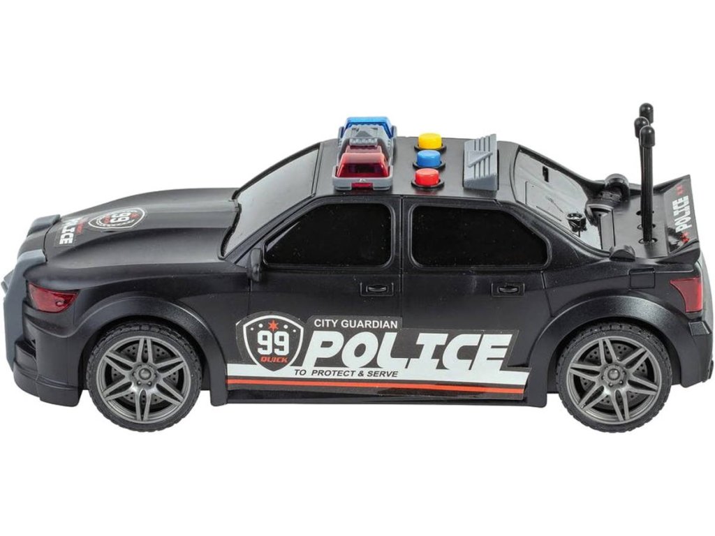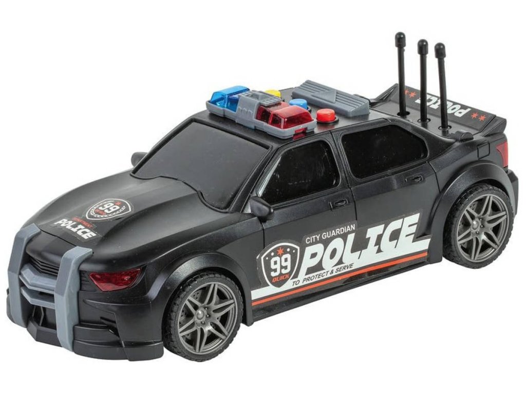 Policejní auto v černé barvě se světelným a zvukovým efektem. Zažijte vzrušení z jízdy s tímto policejním autem vybaveným světelnými a zvukovými efekty! Auto svítí blikajícími modrými světly a vydává autentické zvuky sirén, které přidávají na napětí a zábavě. Potěší jako dárek malé obdivovatele policie.