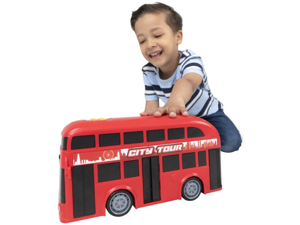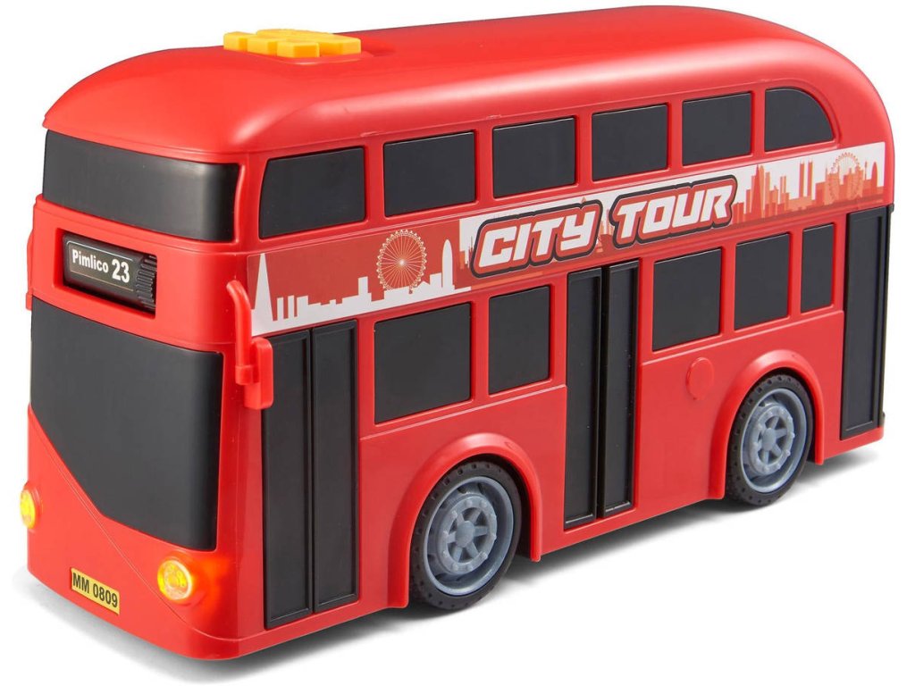 Červený dvoupatrový autobus - doubledecker o velikosti 18cm. Autobus svítí a vydává zvuky startování, troubení a couvání. Hračka na baterie, se světlem a zvukem.