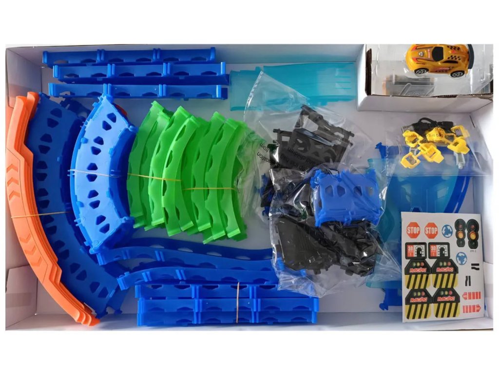 Obsah balení (63 dílků): dráha s doplňky k sestavení (podpěry, mantinely, dopravní značení atd.), autíčko, USB kabel