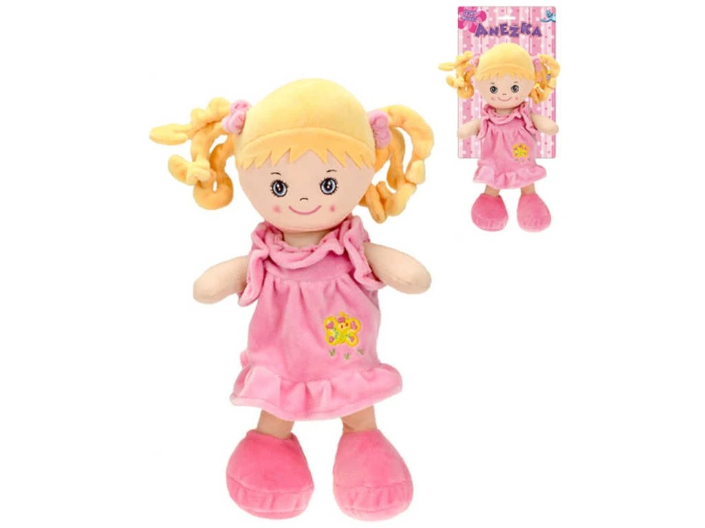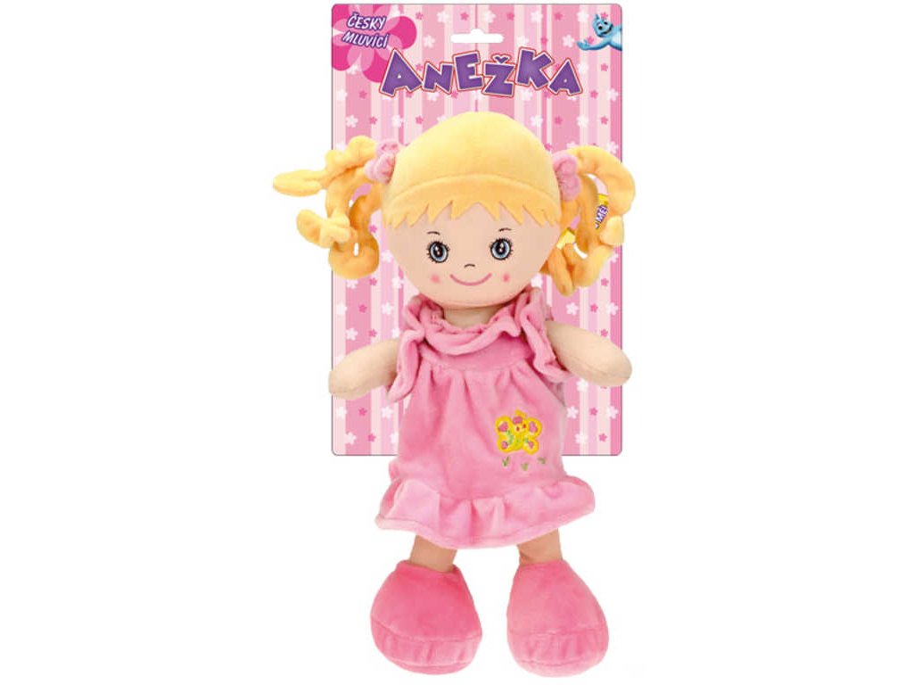 Usměvavá, měkká a lehká paneka holčička Anežka blondýna v šatičkách, se světlými vlásky, s copánky, z plyše, která umí zpívat písničky a mluvit česky. Hračka na baterie se zvukem, česky mluvící.