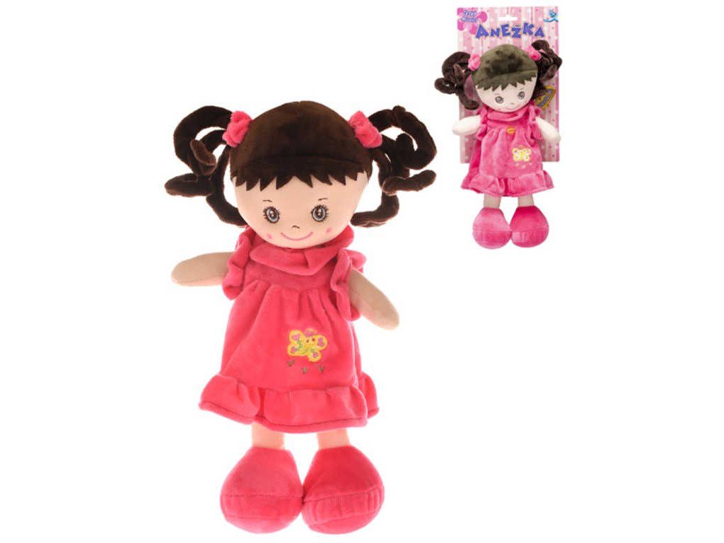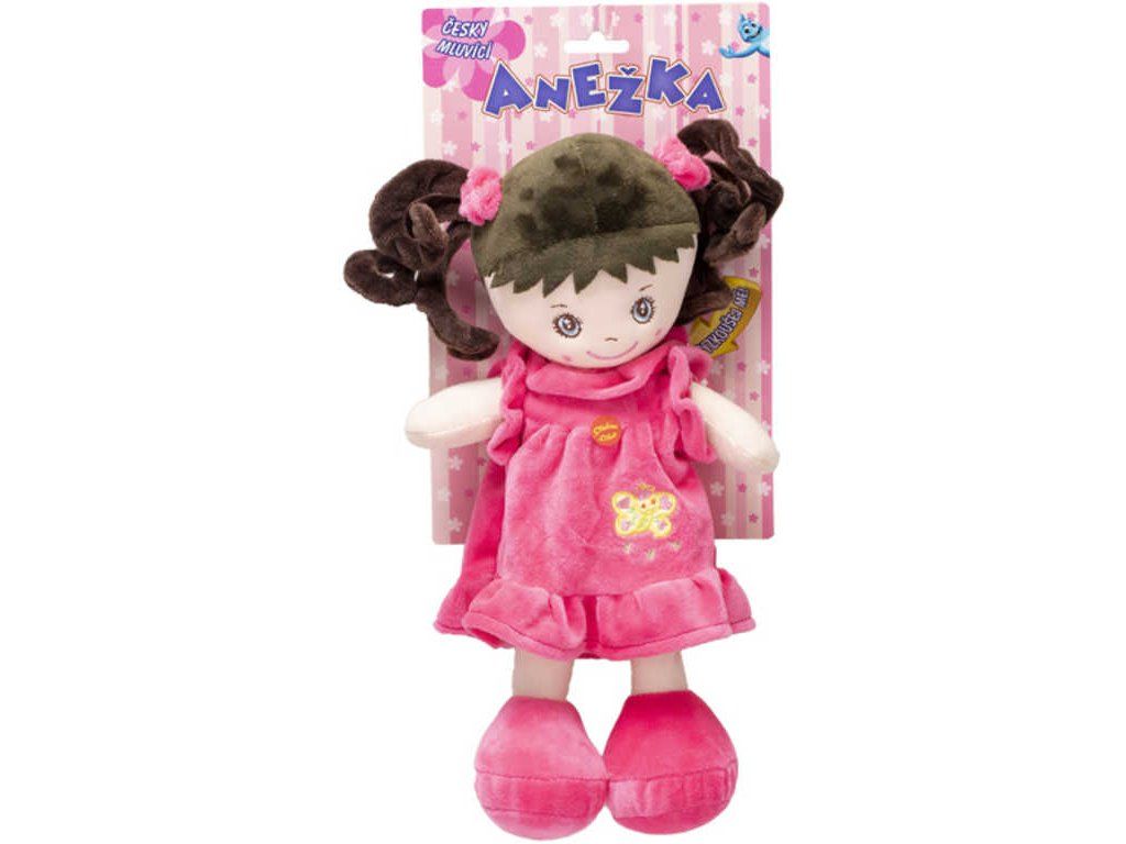 Usměvavá, měkká a lehká paneka holčička Anežka bruneta v šatičkách, s tmavými vlásky, s copánky, z plyše, která umí zpívat písničky a mluvit česky. Hračka na baterie se zvukem, česky mluvící.