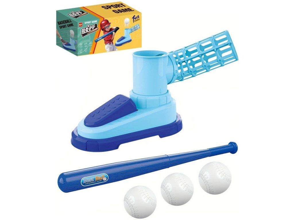 Dětský plastový modrý baseballový herní set. Součástí mechanické odpalovací zařízení, baseballová pálka a 3 míčky.