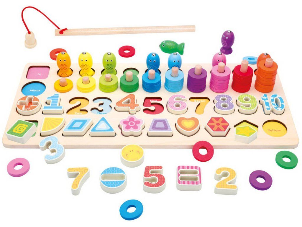 Barevná výuková deska s vícero aktivitami pro malé děti. Dítě se naučí rozpoznávat čísla, tvary a barvy. Hra je ideální pro koordinaci motoriky a pro trénování a posilování logického myšlení. Každé dítě si najde něco, co ho při hře bude bavit. Bude to snad magnetické rybaření, skládání čísel či stohování kroužků na sebe? Hra je vyvinuta s cílem podpořit zájem nejmenších o učení a učení přeměnit na zábavu. Vyrobeno se dřeva. Obsahuje celkem 90kusů.