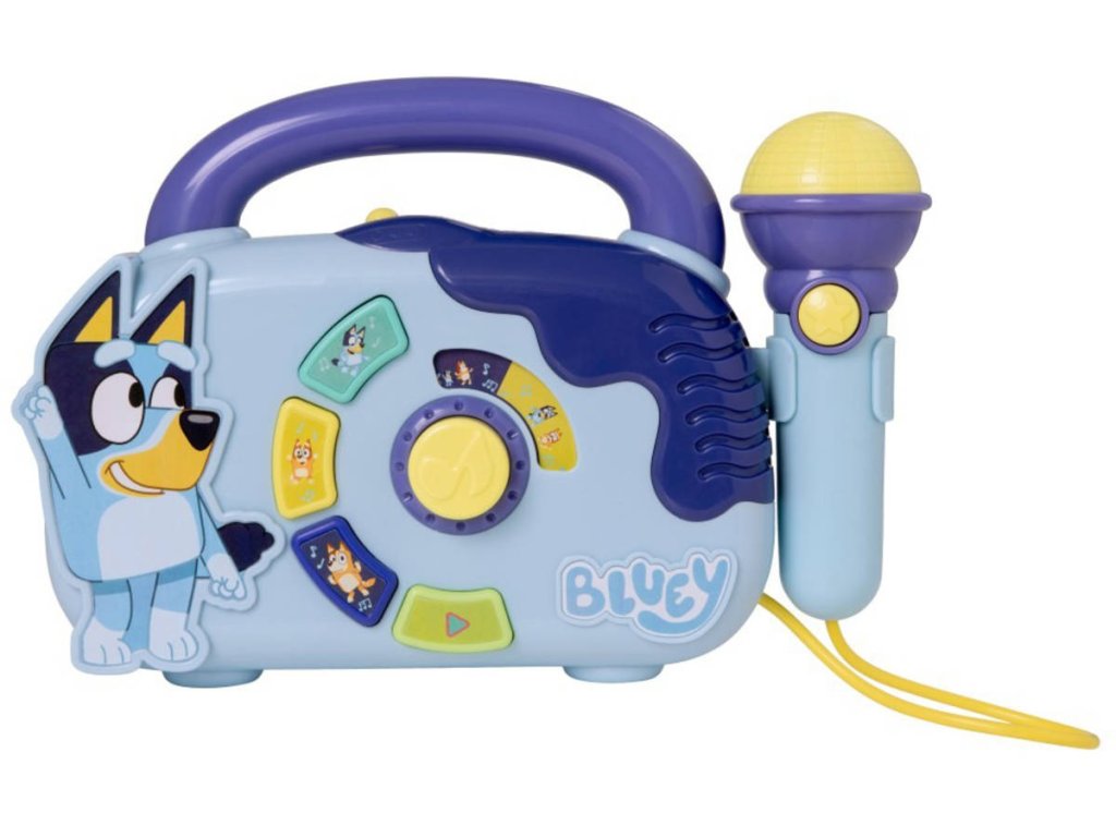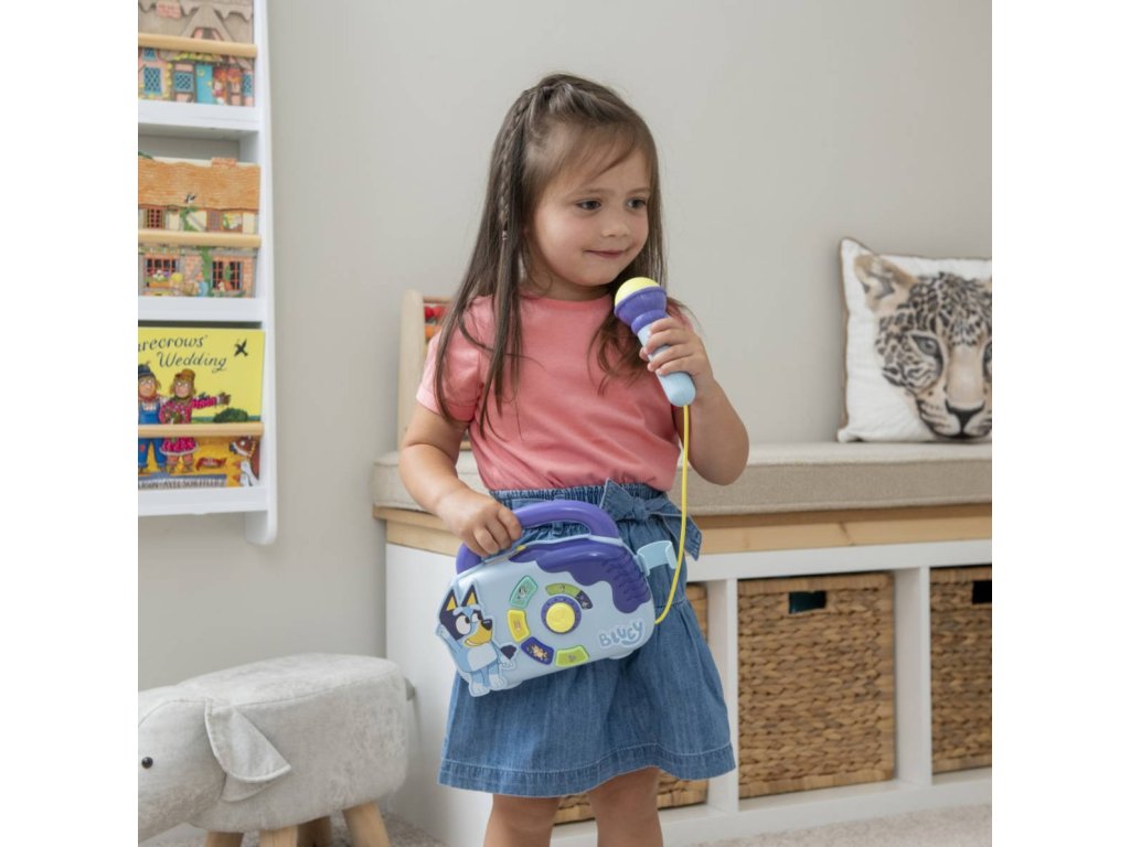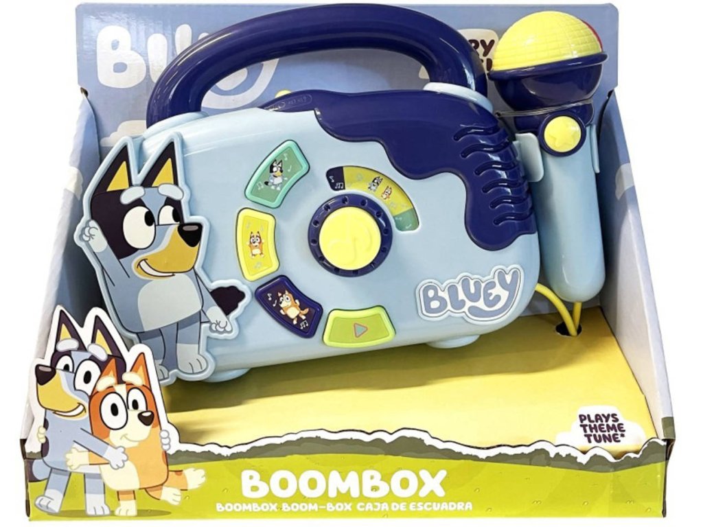 Tento zábavný Boom box s motivem Bluey je ideální pro malé zpěváky a hudebníky! Obsahuje vestavěný mikrofon, který dětem umožňuje zpívat a hrát si na koncert. Boom box přehrává oblíbené písně ze seriálu Bluey a různé zvuky nástrojů, které dodávají zábavné hudební zážitky. Tento interaktivní přístroj pomáhá rozvíjet hudební sluch a kreativitu. Perfektní dárek pro každého malého fanouška Bluey a hudby!